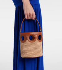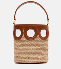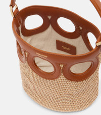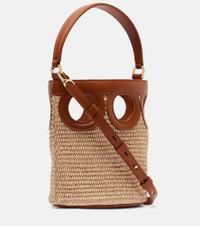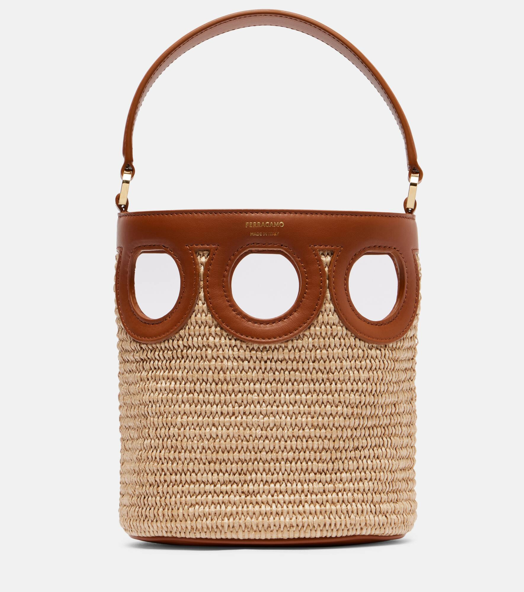 Ferragamo's elite reputation rests upon unparalleled Italian craftsmanship and a legacy of elegance. Crafted from raffia with supple leather trims, the Ganci Frame bucket bag features a charming cut-out design with a detachable shoulder strap. Product Details - Material: raffia, calf leather - Lining: fabric - Made in Italy - Designer color name: Naturale/Naturale Resort/Nat - Item color: beige, brown - Top handle, Detachable, adjustable shoulder strap - Includes: dust bag - Item number: P01070490 Size & Fit - Height 19cm-7.5" - Width 16cm-6.5" - Depth 11cm-4.5" - Length of handles 32cm-12.5" - Adjustable shoulder strap - Max. length shoulder strap 106cm-41.5"