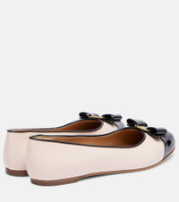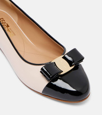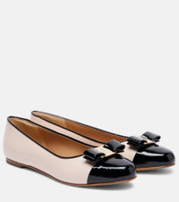 Ferragamo's elite reputation rests upon unparalleled Italian craftsmanship and a legacy of elegance. The Varina ballet flats are expertly made from bi-color leather with signature bow detailing at the vamps. Product Details - Upper: calf leather, leather (nappa) - Lining: leather - Sole: leather insole, rubber sole - Toe shape: almond toe - Made in Italy - Includes: dust bags, shoe box - Designer color name: Nero - Item color: black, pink - Hardware color: gold - Item number: P01090792 Size & Fit - Fits slightly large to size - we recommend trying a half size smaller - European sizes - Ferragamo width C