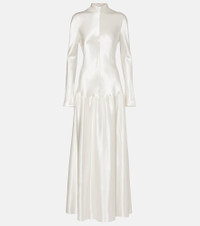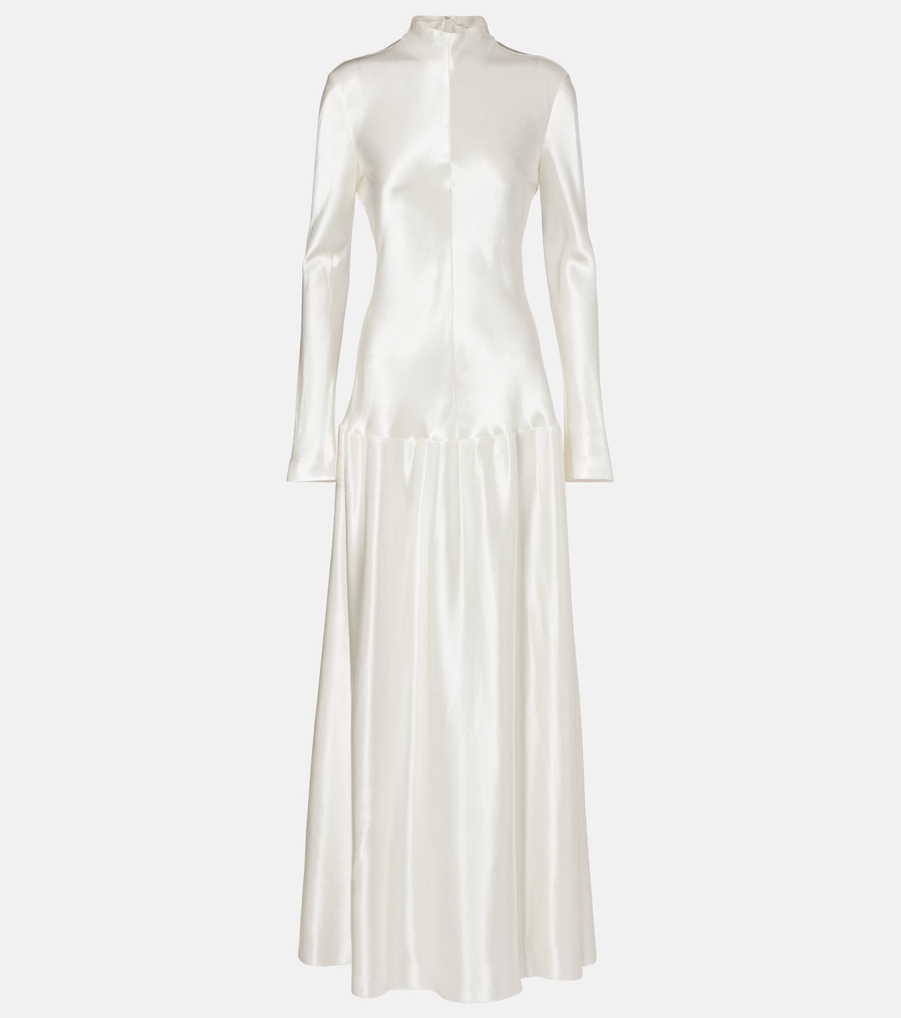 Minimal and exquisitely discreet, Fforme's designs radiate understated refinement. The Mila satin maxi dress boasts a floor-length, sleek silhouette with a dropped waistline and features long sleeves and a high neck. Product Details - Material: 100% viscose - Care instructions: dry clean - Made in Italy - Designer color name: Cream - Item color: white - Lining: 73% acetate, 27% silk - Collar: mockneck - Hem: straight - Closure: concealed zipped back - Item number: P01086111 Size & Fit - Fits large to size - we recommend trying one size smaller - Cinched waist - Non-stretchy fabric - The model seen in the picture is 178cm-5'10" and wearing a size IT 38