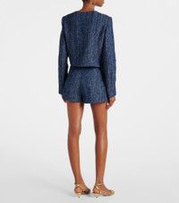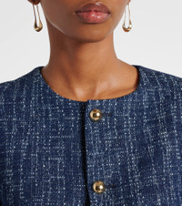 Crafted from pure cotton, this tweed jacket from Frame features a flattering cropped, boxy silhouette. The tailored design is complete with a rounded neckline and gold-tone front button closure. Product Details - Material: 100% cotton - Care instructions: dry clean - Made in Romania - Designer color name: Indigo - Item color: blue - Lining: 60% acetate, 40% viscose - Closure: buttoned front - Pockets: patch pockets, internal pocket - Hardware color: gold - Shoulder pads - Item number: P01055585 Size & Fit - True to size - Shoulder pad inserts - Straight fit - Non-stretchy fabric - Cropped - The model seen in the picture is 178cm-5'10" and wearing a size XS
