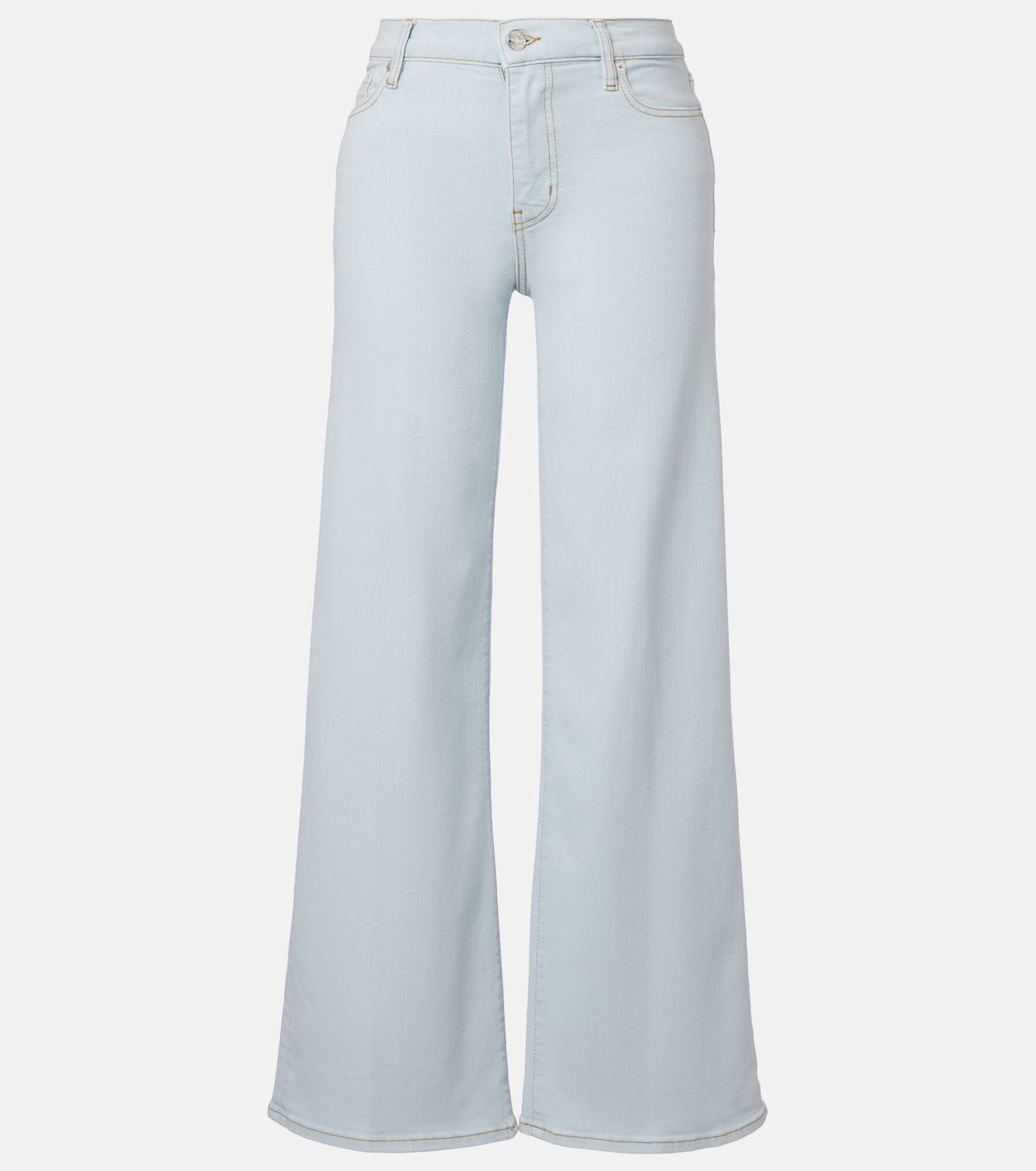 The Le Slim Palazzo high-rise jeans from Frame are a wardrobe staple for everyday looks. Their wide-leg shape is completed with an ankle length and a subtle flare. Product Details - Material: 49% cotton, 21% cotton (recycled), 17% polyester (recycled), 11% lyocell, 2% elastane - Care instructions: machine wash at 30 degrees - Made in Turkey - Designer color name: Feather - Item color: blue - Hardware color: silver - Pockets: five pockets - Closure: zip and button fastening - High-rise - Fit: wide-leg - Item number: P01055554 Size & Fit - True to size - Stretchy fabric - Wide-leg - High-rise - The model seen in the picture is 178cm-5'10" and wearing a size 26