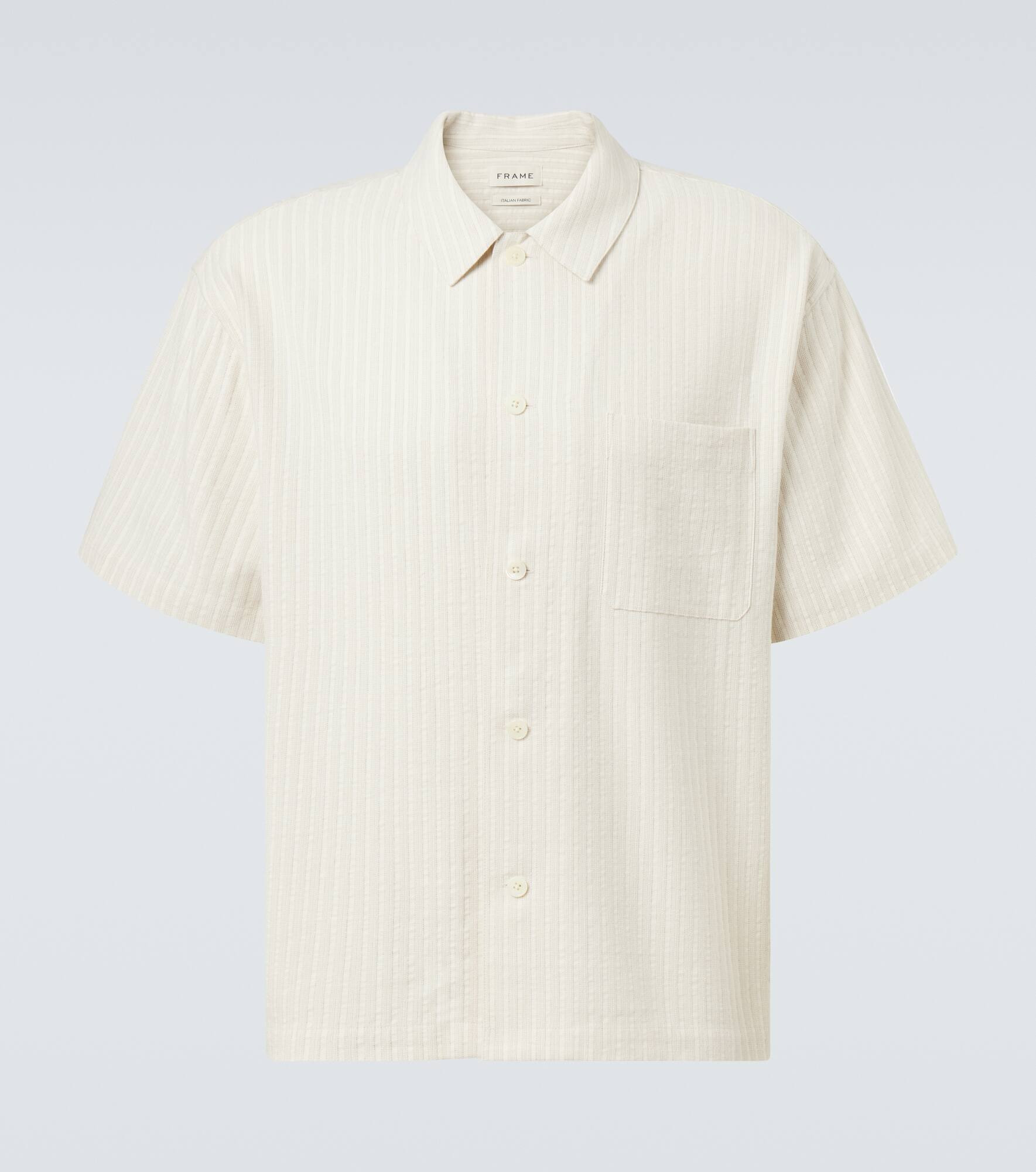 Frame blends laid-back Californian ease with sharp European tailoring – creating timeless essentials designed for modern life. This bowling shirt has a buttoned front and a front pocket and is finished with subtle stripes. Product Details - Material: 40% cotton, 30% viscose, 24% linen, 6% polyester - Care instructions: dry clean - Made in China - Designer color name: White Sand - Item color: white - Item number: P01051333 Size & Fit - True to size - Dropped shoulders - Without pleats in the back - Classic fit - Non-stretchy fabric - Falls to the hip - Height of model is 189cm-74.5" and wears a size L