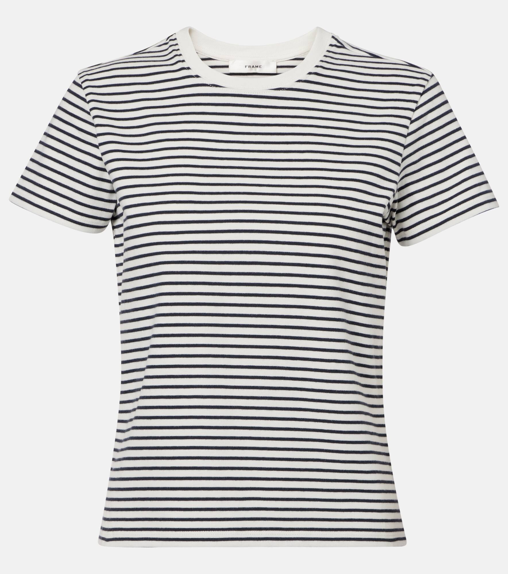 Crafted from ultra-soft cotton, this T-shirt from Frame is cut to a flattering, slightly shrunken fit. The design is complete with a rounded neckline and charming all-over striped print. Product Details - Material: 100% cotton (organic) - Care instructions: machine wash cold - Made in China - Designer color name: Navi Multi - Item color: blue, white - Item number: P01055590 Size & Fit - True to size - Straight fit - Slightly stretchy fabric - Slightly cropped - The model seen in the picture is 178cm-5'10" and wearing a size XS