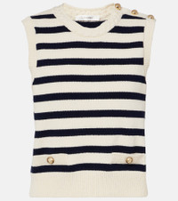 Frame's The Harbor sweater vest draws inspiration from nautical motifs. Knitted from a cotton blend with a striped motif, this style features gold-tone buttons and braided detailing at the neckline. Product Details - Material: 75% cotton, 25% polyamide - Care instructions: dry clean - Made in Bulgaria - Designer color name: Navy Multi - Item color: beige, blue - Collar: crewneck - Closure: buttoned shoulder - Item number: P01055592 Size & Fit - True to size - Straight fit - Stretchy fabric - Slightly cropped - The model seen in the picture is 178cm-5'10" and wearing a size XS