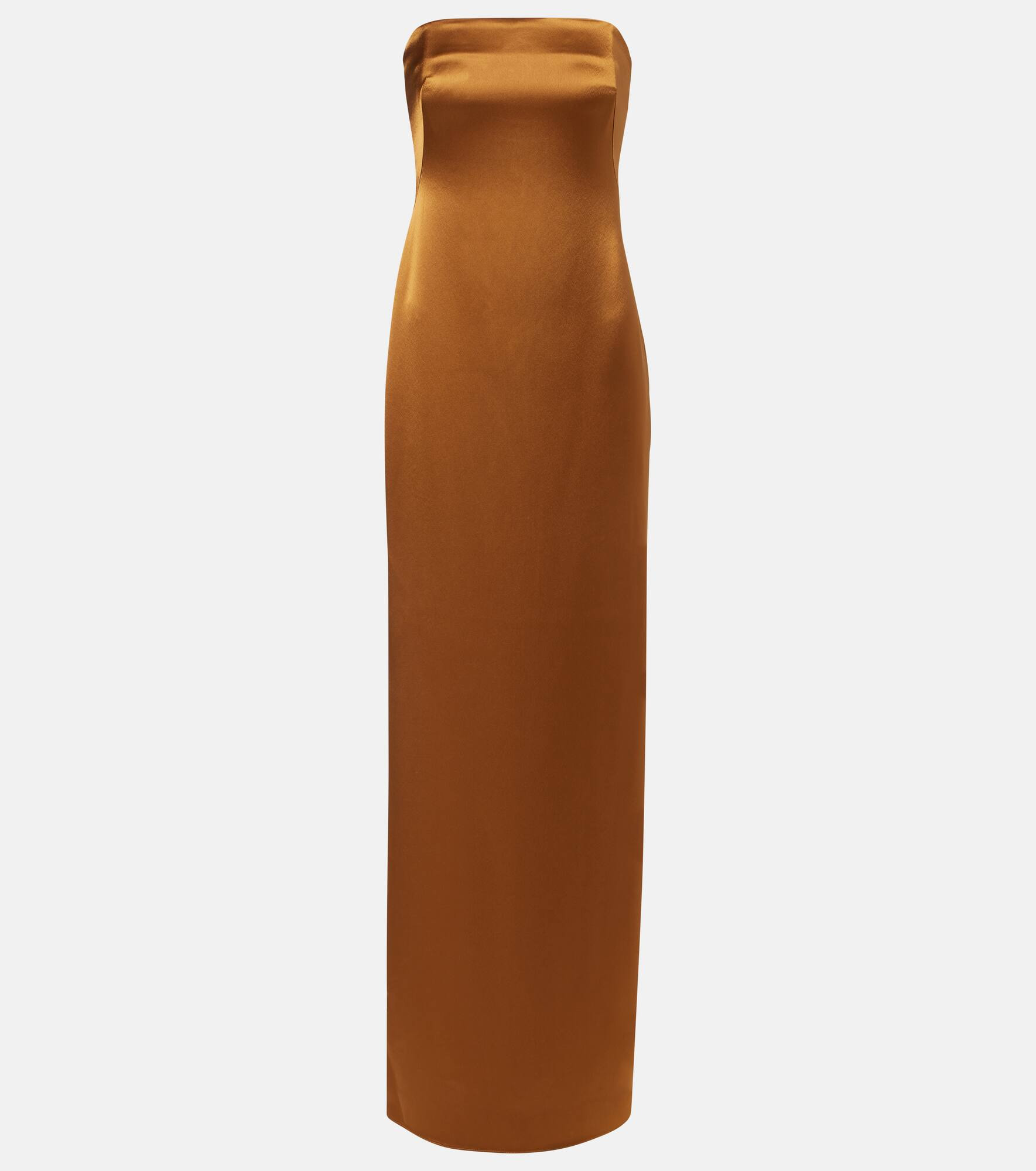 Best-known for its modern take on eveningwear, women-run Galvan covers all the bases for a polished wardrobe. Crafted from satin, this bustier gown features a strapless column silhouette, finished with a discreet zip closure. Product Details - Material: 80% triacetate, 20% polyester - Care instructions: dry clean - Made in Poland - Designer color name: Toffee - Item color: brown - Lining: 82% polyamide, 18% elastane - Closure: invisible zipper - Built-in bustier - Boning - Long vent - Item number: P01069767 Size & Fit - True to size - Strapless - Internal boned corset for support - Fitted - Non-stretchy fabric - slit length 81cm-32" - The model seen in the picture is 178cm-5'10" and wearing a size FR 36