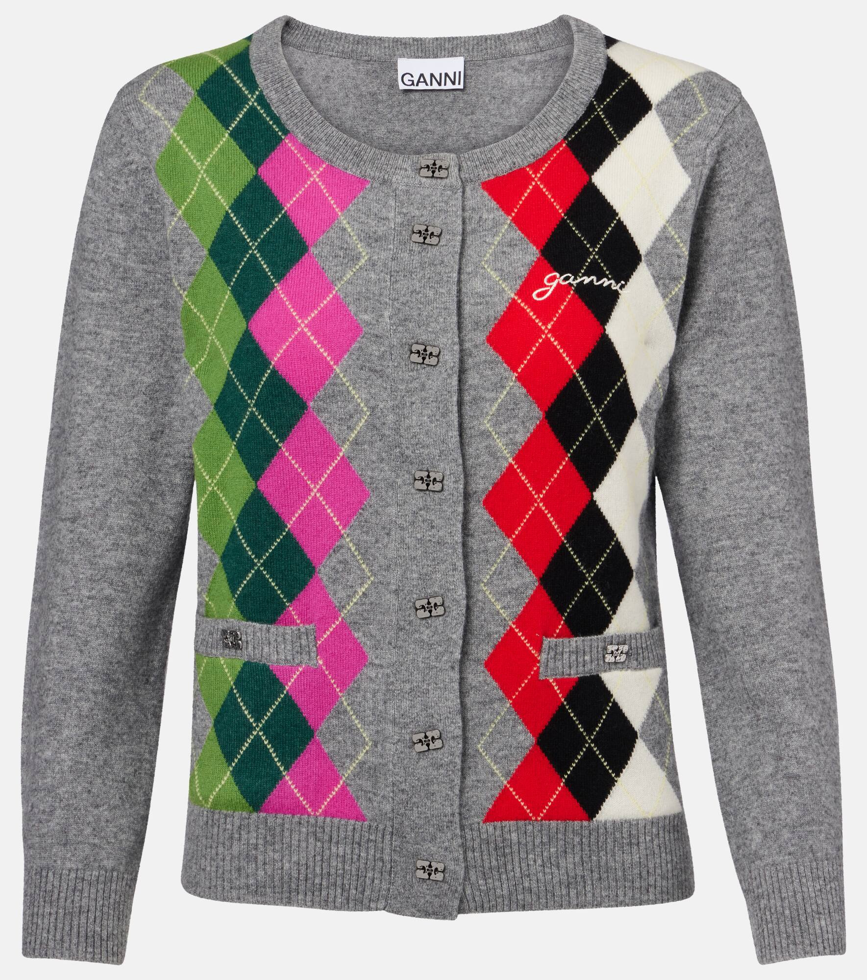Copenhagen-based brand Ganni reshapes the meaning of Scandinavian style with its whimsical approach to design. This cardigan is crafted from wool and cashmere into a classic Argyle pattern. Product Details - Material: 70% wool (merino wool), 30% cashmere - Care instructions: hand wash - Made in China - Designer color name: Paloma Melange - Item color: multicolor, gray - Closure: buttoned front - Pockets: welt pockets - Hardware color: silver - Item number: P01076801 Size & Fit - True to size - Straight fit - Stretchy fabric - Falls to the hip - The model seen in the picture is 178cm-5'10" and wearing a size XS
