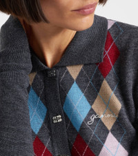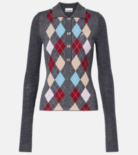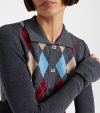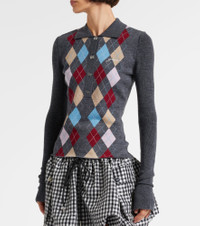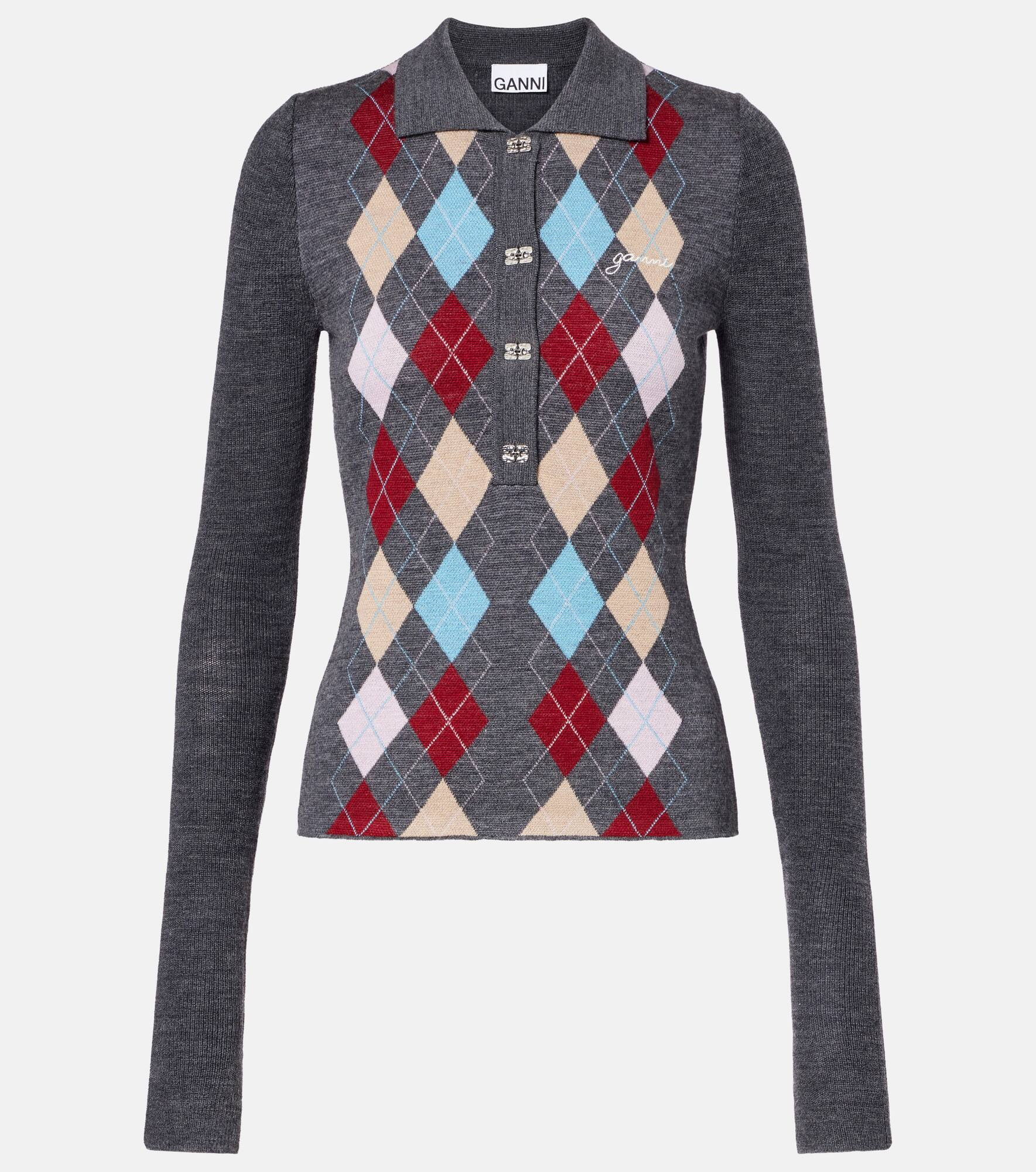 Copenhagen-based brand Ganni reshapes the meaning of Scandinavian style with its whimsy and playful approach to design. Crafted from wool, this polo sweater is elevated by an argyle pattern and signature butterfly buttons. Product Details - Material: 100% wool (merino wool) - Care instructions: hand wash - Made in China - Designer color name: Paloma - Item color: gray, multicolor - Collar: polo collar - Closure: partially buttoned front - Item number: P01090577 Size & Fit - True to size - Fitted - Slightly stretchy fabric - Falls to the hip - The model seen in the picture is 178cm-5'10" and wearing a size XS