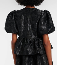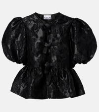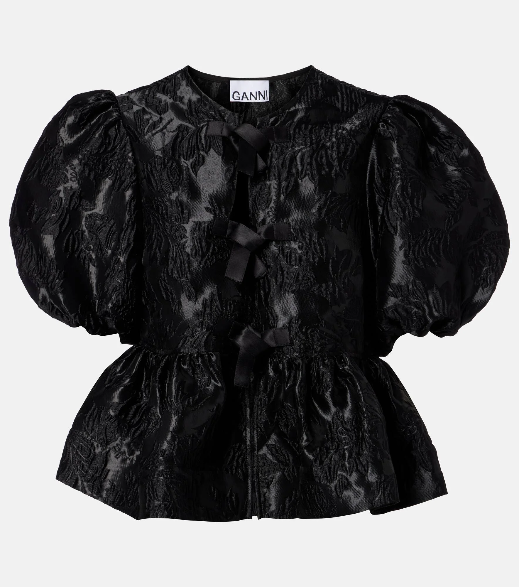 Copenhagen-based brand Ganni reshapes the meaning of Scandinavian style with its whimsy and playful approach to design. This peplum blouse is made from floral-textured satin and is characterized by self-tie bows, puff sleeves, and a peplum silhouette. Product Details - Material: 90% polyester (recycled), 10% polyamide - Care instructions: hand wash - Made in China - Color: black - Designer color name: Black - Item color: black - Closure: self-ties - Cuff: elasticated - Item number: P01135199 Size & Fit - True to size - Straight fit - Non-stretchy fabric - Falls to the hip - The model seen in the picture is 178cm-5'10" and wearing a size DE 34