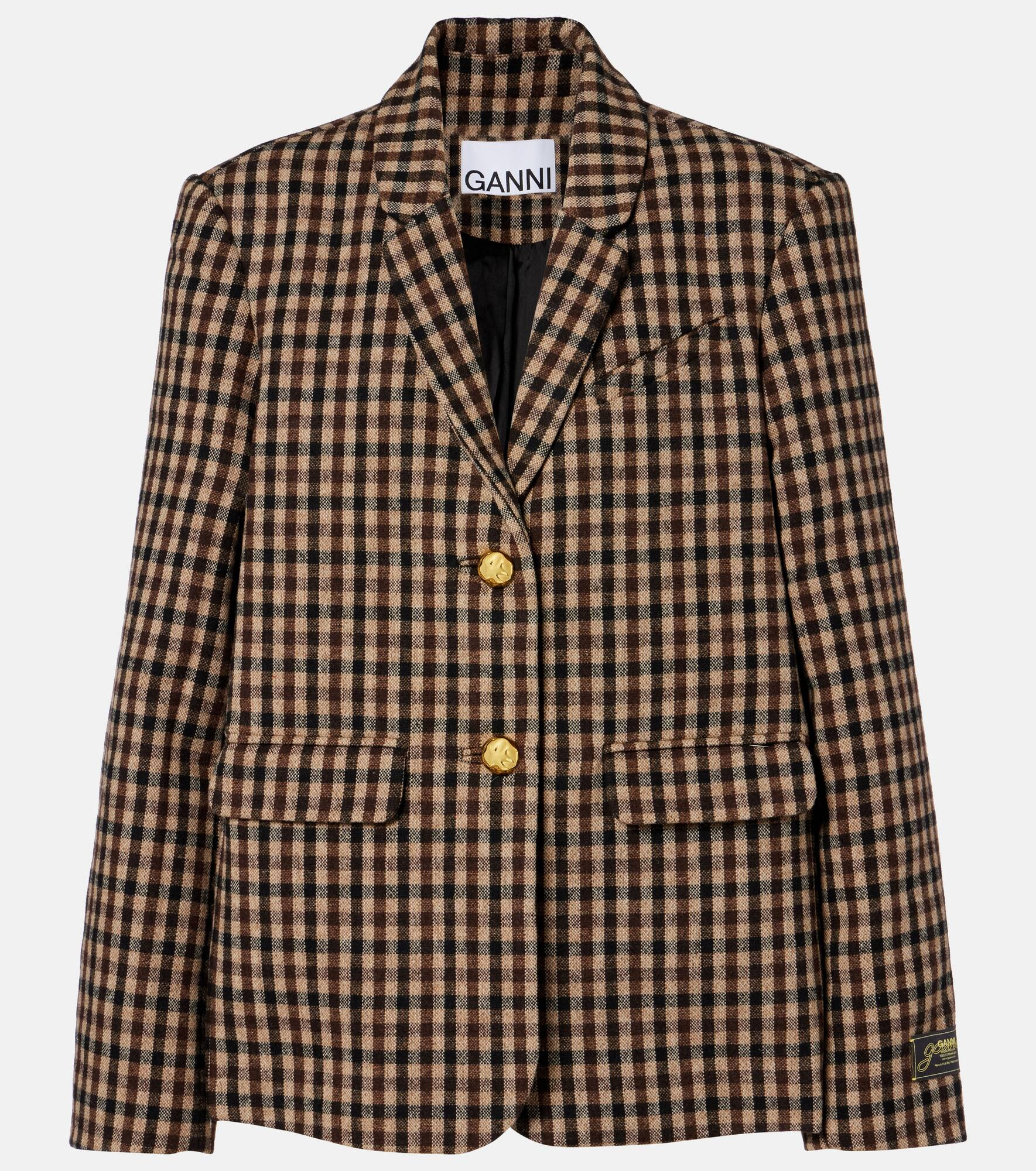 This Ganni blazer brings timeless elegance with its checked pattern and padded shoulders that add structure to the silhouette. This garment reflects the brand's Scandinavian style with its whimsy and playful approach to design. Product Details - Material: 75% polyester (recycled), 25% wool - Care instructions: dry clean - Made in China - Designer color name: Chicory Coffee - Item color: brown - Lining: 57% acetate, 43% viscose - Closure: single-breasted (two buttons) - Pockets: flap pockets - Notched lapel - Item number: P01076774 Size & Fit - Fits large to size - we recommend trying one size smaller - Shoulder pad inserts - Designed for a loose fit - Non-stretchy fabric - Falls below the hip - The model seen in the picture is 178cm-5'10" and wearing a size DE 32