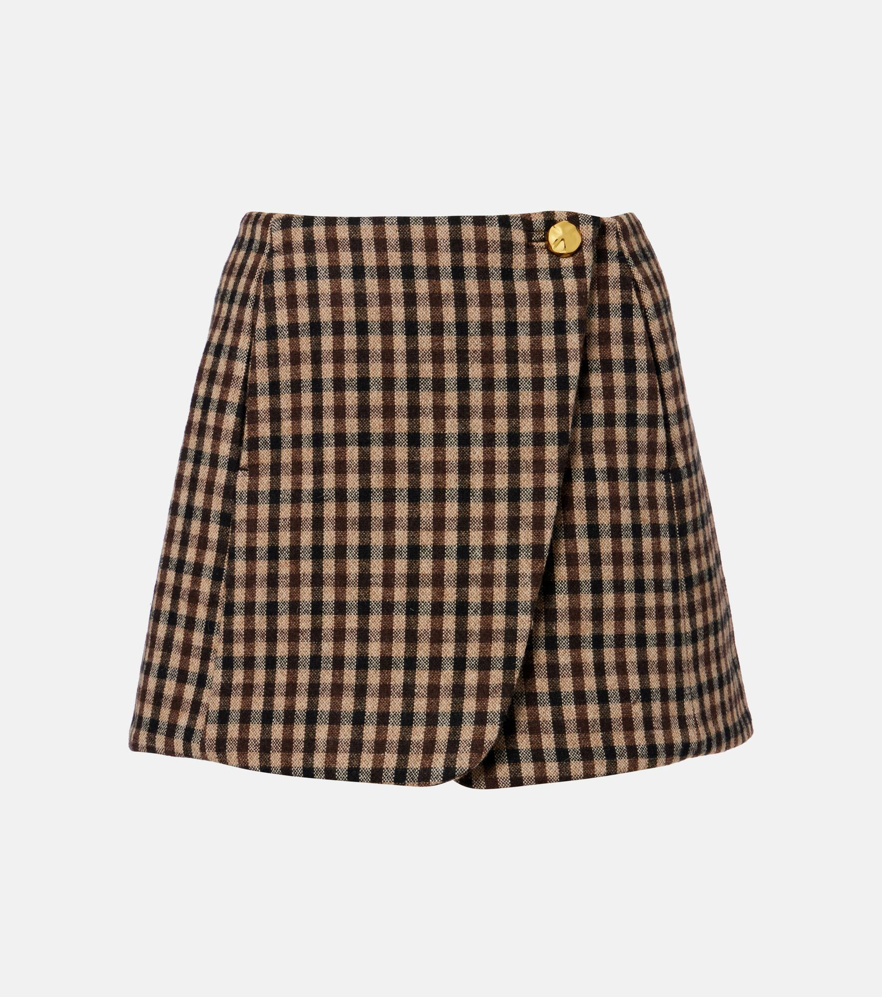 This wool wrap skirt by Ganni brings timeless elegance with its checked pattern and mini silhouette. This garment reflects the brand's Scandinavian style with its whimsy and playful approach to design. Product Details - Material: 75% polyester (recycled), 25% wool (recycled) - Care instructions: dry clean - Made in China - Designer color name: Chicory Coffee - Item color: brown, beige - Lining: 57% acetate, 43% viscose - Closure: button fastening - Hardware color: gold - Pockets: side slit pockets - Item number: P01076773 Size & Fit - True to size - Non-stretchy fabric - The model seen in the picture is 178cm-5'10" and wearing a size DE 34