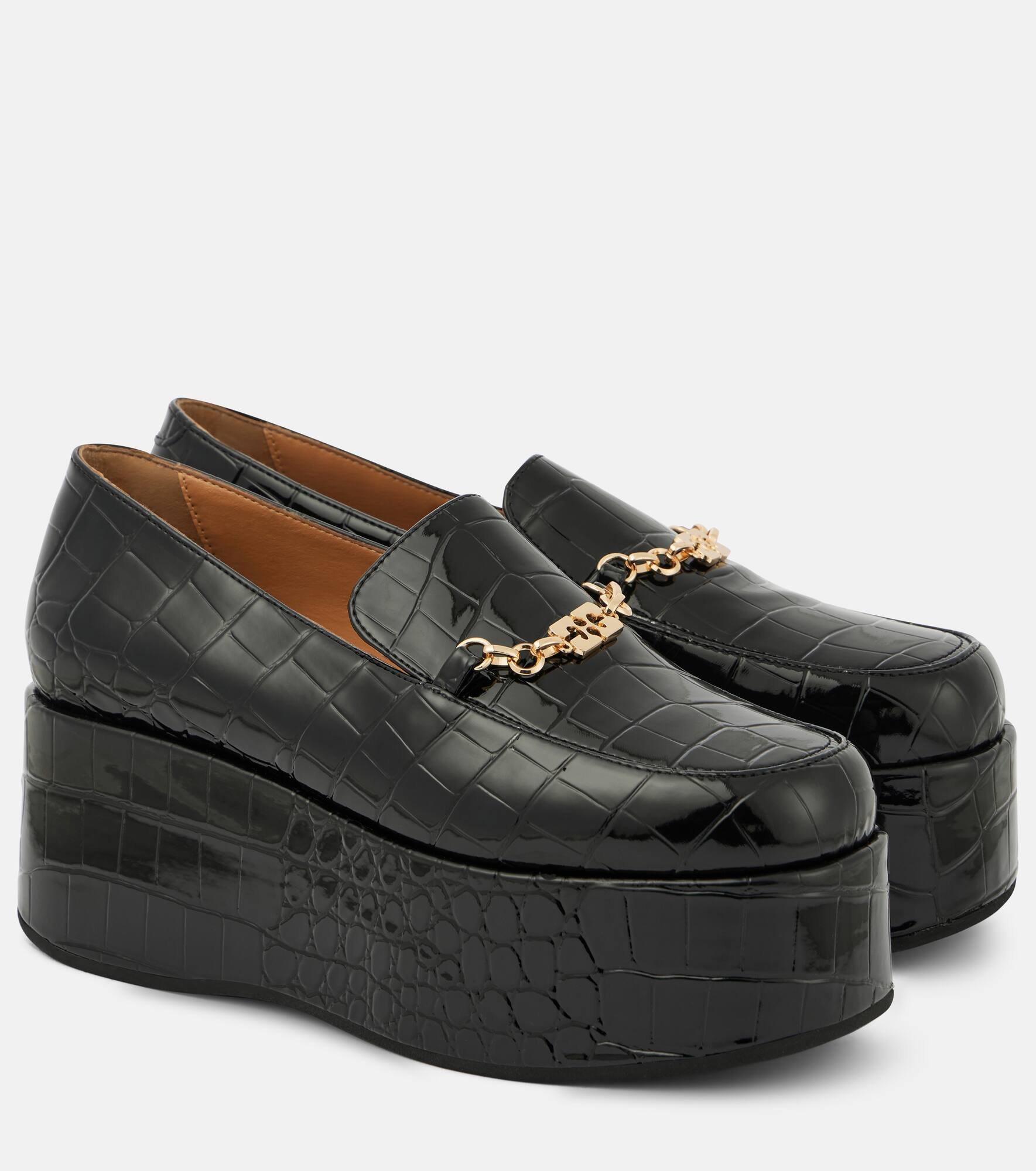 BLACK PATENT CROCO BUTTERFLY CHAIN PLATFORM LOAFERS