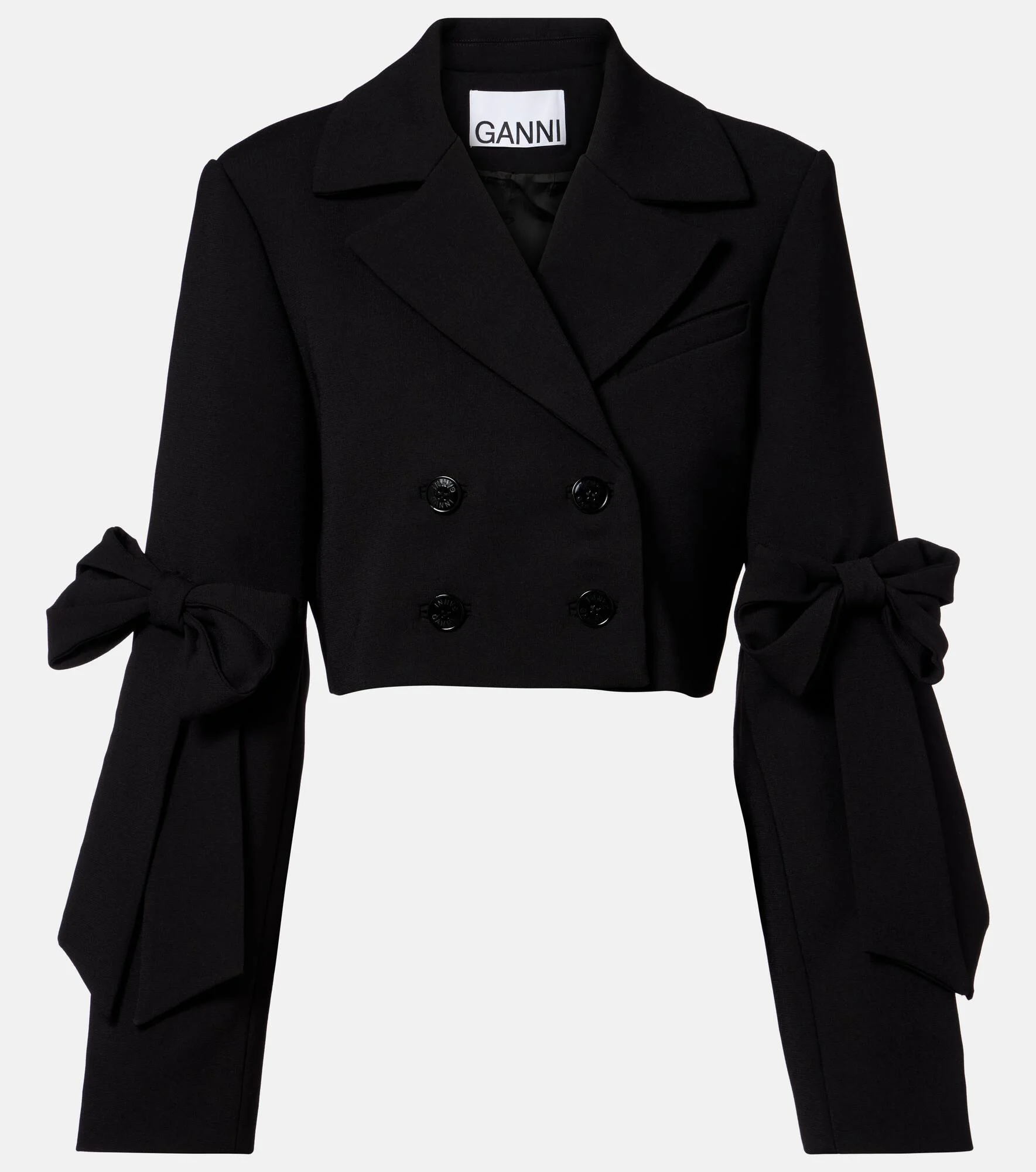 Copenhagen-based brand Ganni reshapes the meaning of Scandinavian style with its whimsy and playful approach to design. This blazer is a double-breasted piece cut to a cropped silhouette with bow details on both sleeves. Product Details - Material: 100% polyester (recycled) - Care instructions: dry clean - Made in China - Color: black - Designer color name: Black - Lining: 57% acetate, 43% viscose - Closure: double-breasted (four buttons) - Item number: P01135204 Size & Fit - True to size - Shoulder pad inserts - Cinched waist - Non-stretchy fabric - Cropped - The model seen in the picture is 178cm-5'10" and wearing a size DE 34