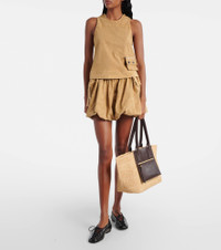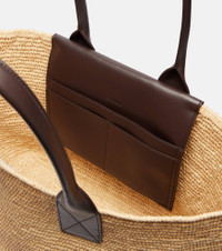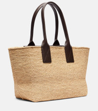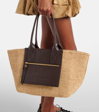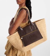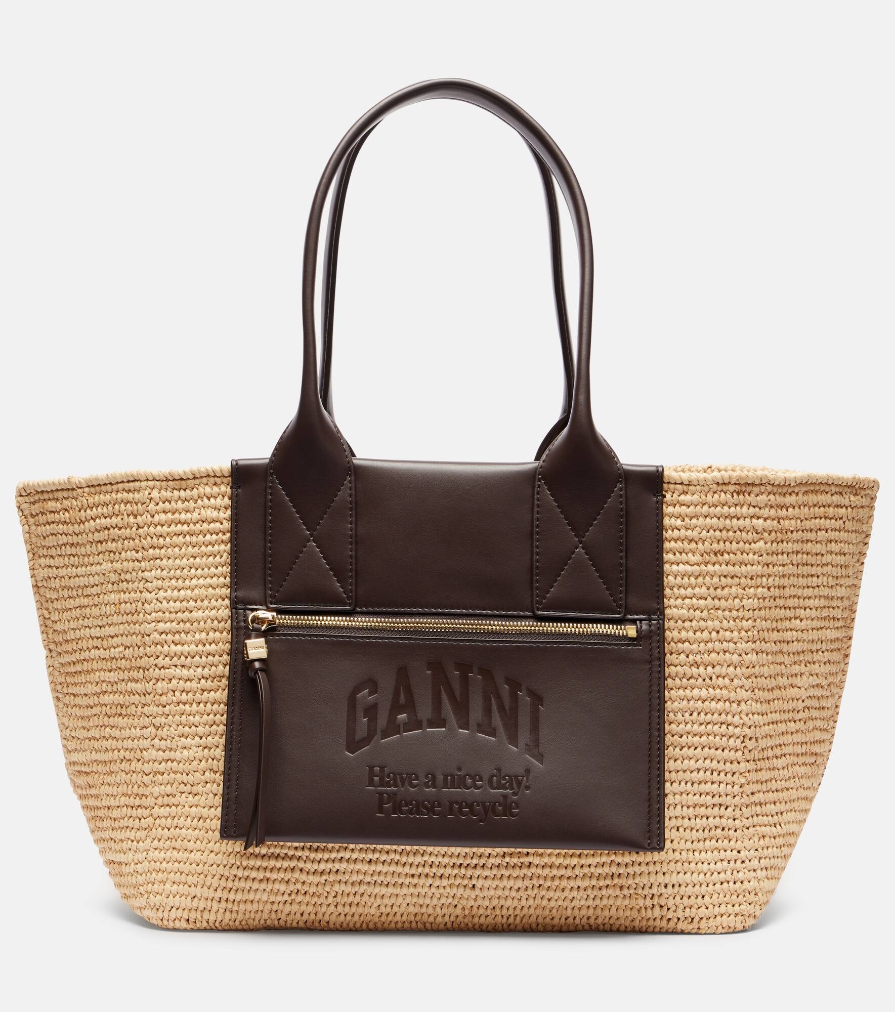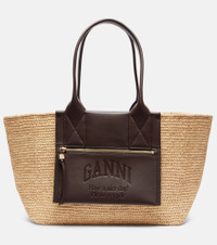 This tote bag from Ganni is made from raffia and trimmed with faux leather featuring an embossed logo. The design has two top handles, a spacious interior, and a zipped pocket. Product Details - Material: raffia, polyurethane - Lining: polyurethane - Made in China - Designer color name: Seal Brown - Item color: beige - Details: raffia - Item number: P01046951 Size & Fit - Height 25cm-10" - Width 50cm-19.5" - Depth 17cm-6.5" - Length of handles 54cm-21.5"