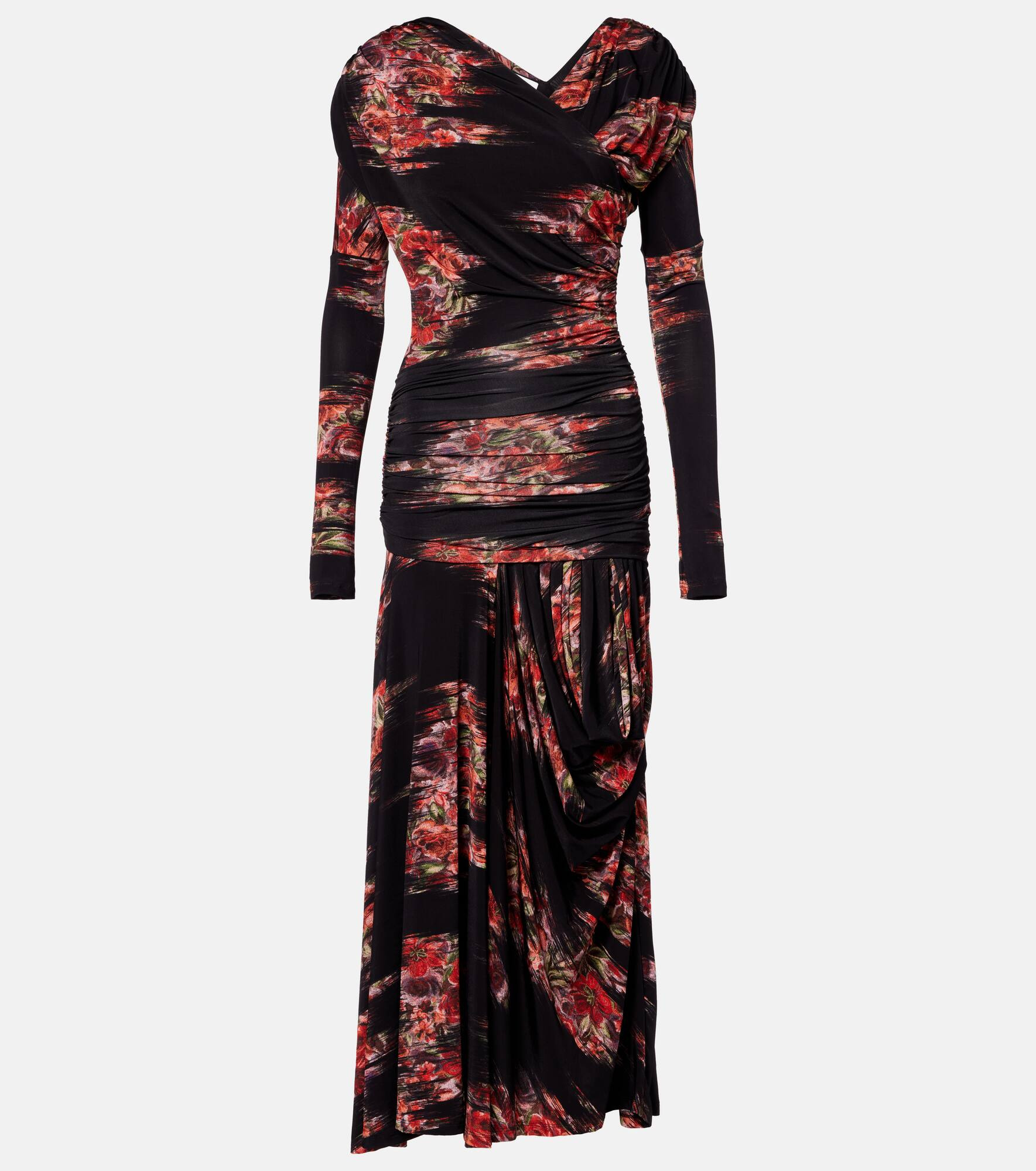 This Ganni maxi dress is crafted from fluid jersey and tailored to an ankle-length silhouette with all-over floral prints. The design is structured with a flared, voluminous skirt and a wrap bodice with ruched detailing. Product Details - Material: 95% viscose, 5% elastane - Care instructions: dry clean - Made in Turkey - Designer color name: Black - Item color: black, multicolor - Lining: 90% polyester (recycled), 10% elastane - Closure: concealed zipped back - Item number: P01090581 Size & Fit - True to size - Fitted - Stretchy fabric - The model seen in the picture is 178cm-5'10" and wearing a size DE 34