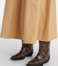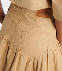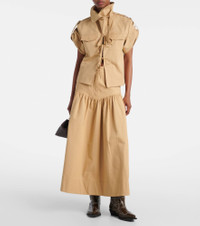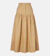 This maxi skirt from Ganni is crafted from cotton and linen for a lightweight texture during warm months. This piece is shaped with a high-rise waistline and flows into a flared silhouette with gathered detailing. Product Details - Material: 83% cotton (organic), 17% linen - Care instructions: machine wash at 30 degrees - Made in Turkey - Designer color name: Pale Khaki - Item color: beige - Lining: 100% cotton - Closure: zipper fly, button fastening - Pockets: five pockets - Item number: P01076784 Size & Fit - True to size - Non-stretchy fabric - High-waisted - The model seen in the picture is 178cm-5'10" and wearing a size DE 34