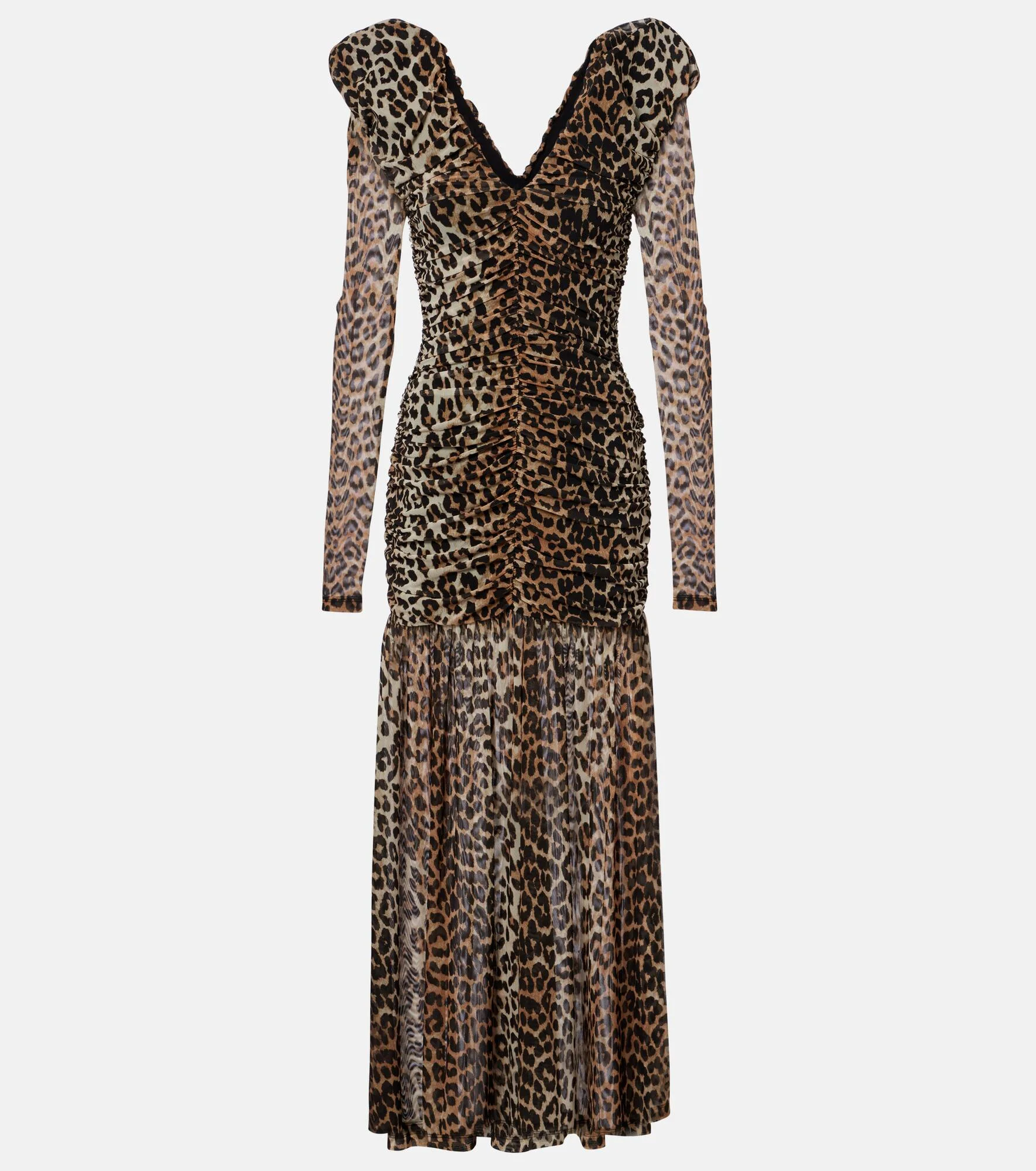Copenhagen-based brand Ganni reshapes the meaning of Scandinavian style with its whimsy and playful approach to design. This maxi dress is made from leopard-printed cloque. Product Details - Material: 91% polyamide (recycled), 9% elastane - Care instructions: machine wash at 30 degrees - Made in China - Color: brown - Designer color name: Big Leopard Almond Milk - Item color: brown - Lining: 94% polyester (recycled), 6% elastane - Collar: V-neck - Item number: P01135220 Size & Fit - True to size - Fitted - Slightly stretchy fabric - The model seen in the picture is 178cm-5'10" and wearing a size DE 34