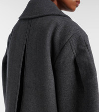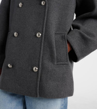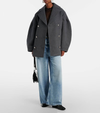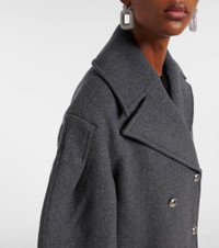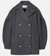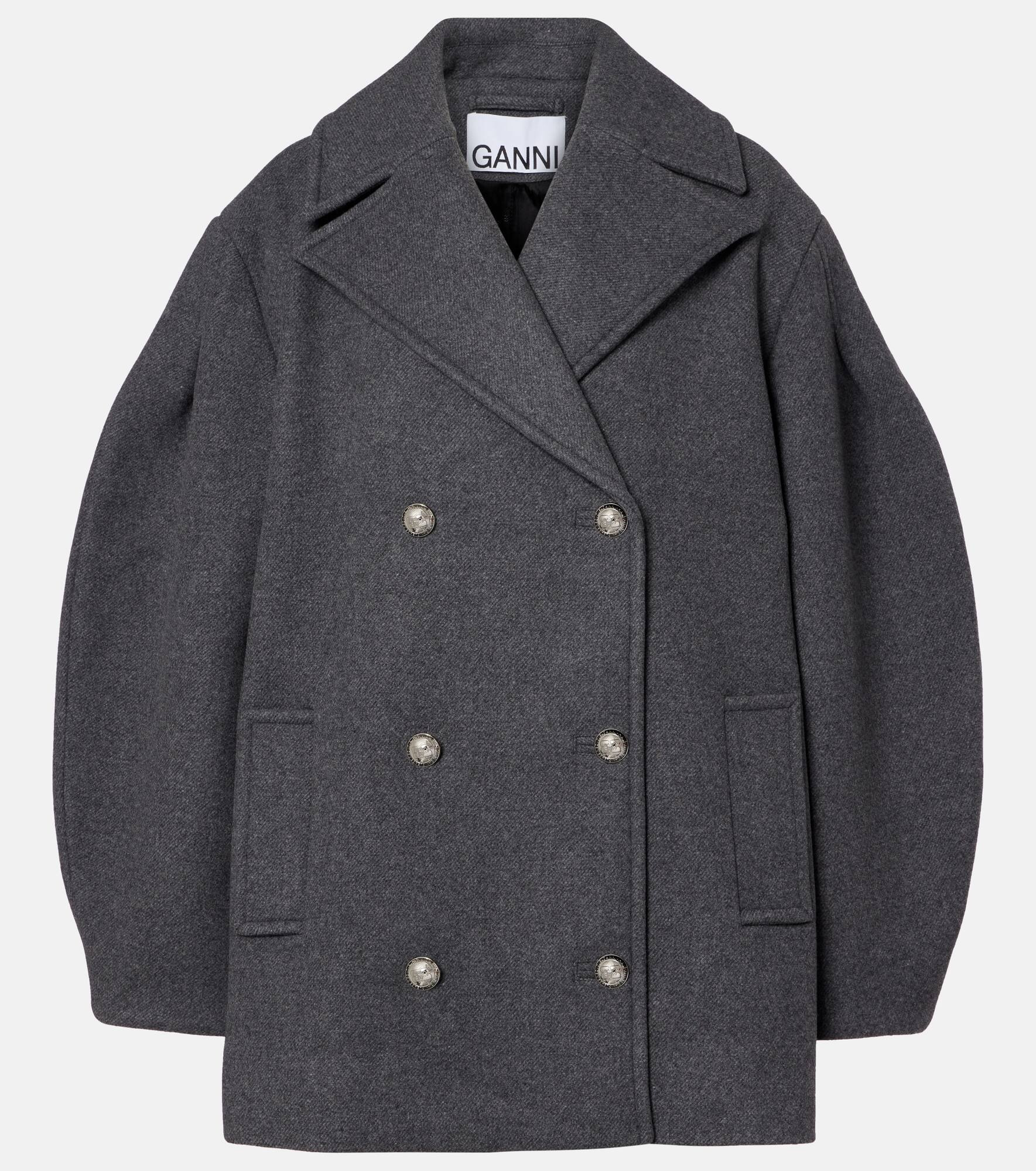 Copenhagen-based Ganni elevates Scandinavian style with a whimsical yet sophisticated design ethos. This oversized wool-blend peacoat features peak lapels, welt and inner pockets, and a double-breasted silhouette. Product Details - Material: 76% wool (recycled), 19% polyester, 4% cashmere, 1% nylon - Care instructions: dry clean - Made in China - Designer color name: Pewter - Item color: gray - Lining: 57% acetate, 43% viscose - Hardware color: silver - Pockets: welt pockets, internal pocket - Closure: double-breasted (six buttons) - Item number: P01090597 Size & Fit - Fits large to size - we recommend trying one size smaller - Dropped shoulders - Designed for a loose fit - Non-stretchy fabric - Falls below the hip - The model seen in the picture is 178cm-5'10" and wearing a size DE 32