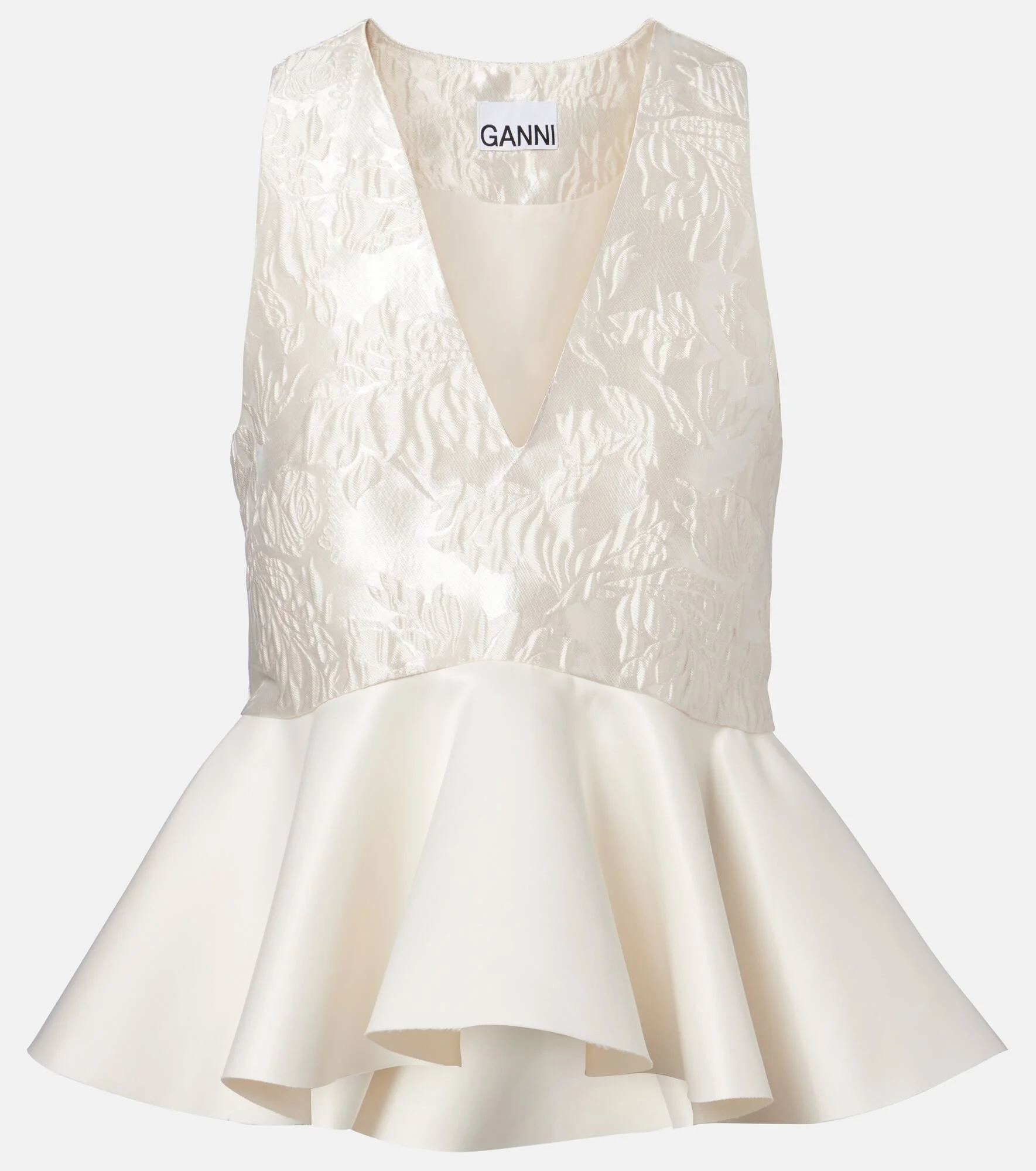 Copenhagen-based brand Ganni reshapes the meaning of Scandinavian style with its whimsy and playful approach to design. This top is cut from a lustrous satin cloque, complemented by a flattering peplum silhouette. Product Details - Material: 90% polyester (recycled), 10% polyamide - Care instructions: hand wash - Made in China - Color: white - Designer color name: Egret - Item color: white - Lining: 94% polyester (recycled), 6% elastane - Trim: 100% polyester (recycled) - Collar: V-neck - Closure: concealed zipped side - Item number: P01135197 Size & Fit - True to size - Straight fit - Non-stretchy fabric - Falls to the hip - The model seen in the picture is 178cm-5'10" and wearing a size DE 34