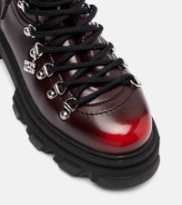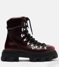 Inspired by a mountain style, these Ganni combat boots feature a classic lace-up silhouette. The pair features the signature Butterfly charms and sits atop platform soles with cleats for enhanced grip. Product Details - Upper: polyurethane, polyester - Lining: polyurethane, polyester - Sole: faux leather insole, rubber sole - Toe shape: round toe - Made in Portugal - Includes: dust bag, extra laces, shoe box - Designer color name: Black/Dark Burgundy - Item color: burgundy, black - Closure: lace-up - Item number: P01101068 Size & Fit - True to size - Half sizes please take the next size up - European sizes - 5,5cm-2" heel (size EU 38) - 4,5cm-2" platform (size EU 38)