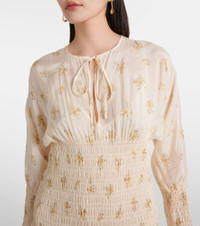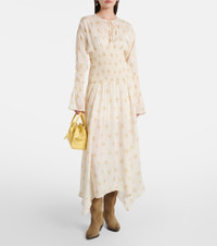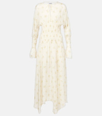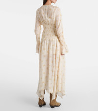 Copenhagen-based brand Ganni reshapes the meaning of Scandinavian style with its whimsy and playful approach to design. This ethereal maxi dress features a light-catching print and is finished with smocked details. Product Details - Material: 100% viscose - Care instructions: machine wash at 30 degrees - Made in India - Designer color name: Antique White - Item color: yellow - Closure: self-ties - Detachable lining - Item number: P01066309 Size & Fit - True to size - Semi-sheer - Loose fit, elasticated waist - Non-stretchy fabric - The model seen in the picture is 178cm-5'10" and wearing a size DE 34