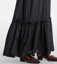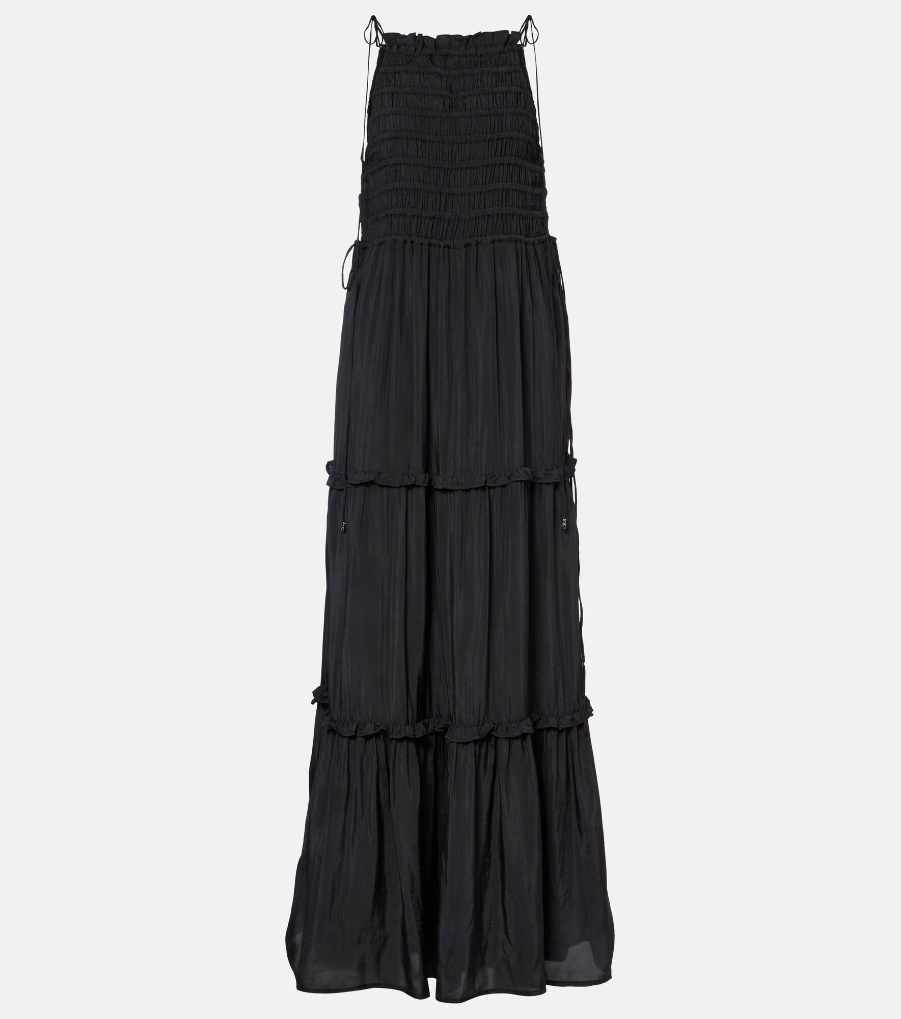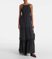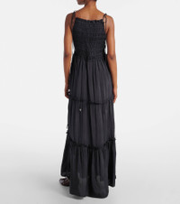 Ganni reshapes the meaning of Scandinavian style with its whimsy and playful approach to design. Complete with an adjustable waistband, this maxi dress is shaped with a tiered skirt and a smocked bodice that features self-tie straps. Product Details - Material: 100% viscose - Care instructions: machine wash at 30 degrees - Made in India - Designer color name: Phantom - Item color: black - Self-tie shoulder straps - Elasticated drawstring waist - Partially lined - Item number: P01076807 Size & Fit - True to size - Elasticated top - Cinched waist - Non-stretchy fabric - The model seen in the picture is 178cm-5'10" and wearing a size DE 34