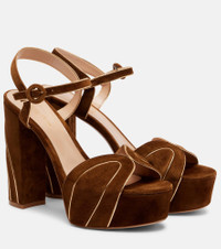 Crafted in Italy from suede, these platform sandals from Gianvito Rossi feature block heels and elegant gold accents. The design is finished with leather insoles and leather and rubber soles on almond open-toe silhouettes. Product Details - Upper: leather (suede) - Lining: leather - Sole: leather insole, leather and rubber sole - Toe shape: almond open toe - Made in Italy - Includes: dust bag, shoe box - Designer color name: Tekax+Mekong - Item color: brown, gold - Closure: buckle-fastening ankle strap - Item number: P01096396 Size & Fit - True to size - Best fit for narrow feet - European sizes - 12,5cm-5" heel (size EU 38) - 4,5cm-2" platform (size EU 38)