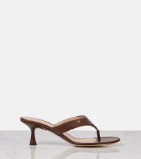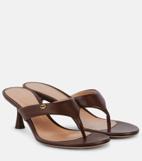Crafted in Italy from soft leather, the Ascent thong sandals from Gianvito Rossi feature leather insoles and soles on round open-toe silhouettes. The brand's symbol is showcased in gold-tone hardware on the straps. Product Details - Upper: leather - Lining: leather - Sole: leather insole and sole - Toe shape: round open toe - Made in Italy - Includes: shoe box, dust bag - Designer color name: Brown - Item color: brown - Hardware color: gold - Item number: P01063454 Size & Fit - True to size - Slightly wide - European sizes - 5,5cm-2" heel (size EU 38)