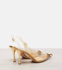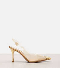Crafted from materials of the highest quality, Gianvito Rossi’s designs are handmade using both traditional craftsmanship and innovative techniques. The Diana slingback pumps feature transparent PVC uppers and buckled straps finished with the signature Ribbon detail. Product Details - Upper: leather - Lining: fabric - Sole: leather insole and sole - Toe shape: pointed toe - Made in Italy - Includes: dust bag, shoe box - Designer color name: Mekong+Mekong - Item color: transparent, gold - Item number: P01096377 Size & Fit - True to size - For narrow feet, we recommend trying a half size smaller - Slightly wide at the toe - European sizes - 8,5cm-3.5" heel (size EU 38)