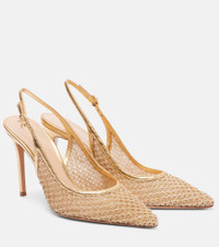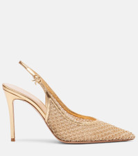 Handcrafted from the finest materials, Gianvito Rossi’s designs combine traditional craftsmanship with innovative techniques. The Itaca leather-trimmed pumps stand tall on 95mm heels, showcasing a gold-hued woven design with slingback silhouettes that exude timeless elegance. Product Details - Upper: fabric - Lining: fabric - Sole: fabric insole, leather sole - Toe shape: pointed toe - Made in Italy - Includes: shoe box, dust bag - Designer color name: Mekong+Mekong - Item color: gold - Trim: leather - Closure: buckle-fastening ankle strap - Item number: P01105534 Size & Fit - True to size - European sizes - 9,5cm-3.5" heel (size EU 38)