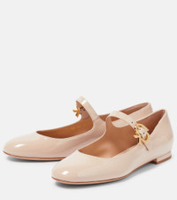 These ballet flats from Gianvitto Rossi are an elegant addition to your footwear staples. Made from patent leather, the dainty style is set atop a small stacked heel and has a gold-toned buckle-fastening ankle strap. Product Details - Lining: leather - Toe shape: round toe - Sole: leather insole and sole - Made in Italy - Comes with dust bag, Comes with a box - Designer color name: Peach - Closure: buckle fastening - Upper: leather - Item number: P00763667 Size & Fit - Fits slightly large to size - we recommend trying a half size smaller - Stiff material - European sizes