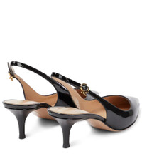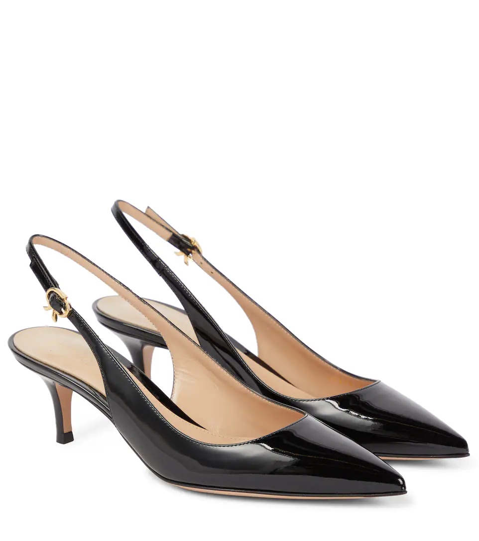 Named for their bow-shaped metal buckles, the black Ribbon Sling pumps from Gianvito Rossi are an elegant daytime option. They're made from patent leather and presented in a point-toe silhouette with comfortable kitten heels. Product Details - Lining: leather - Upper: calf leather - Sole: leather insole and sole - Toe shape: pointed toe - Closure: buckle-fastening ankle strap - Designer color name: Black - Comes with a box - Made in Italy - Comes with dust bag - Item number: P00664498 Size & Fit - True to size - European sizes - 5,5cm-2" heel (size EU 38)