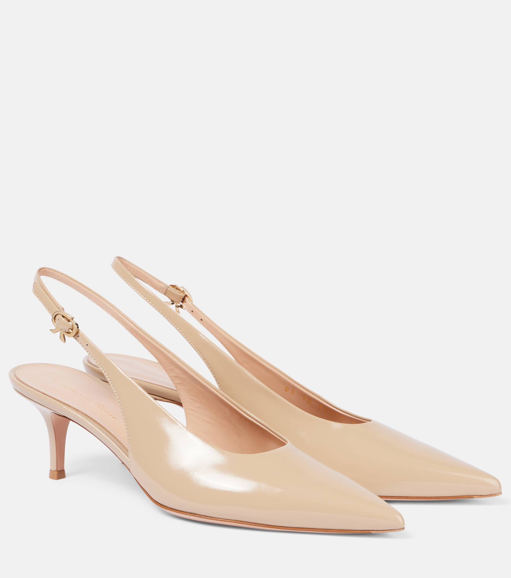 The Robbie pumps are a coveted style that perfectly exemplifies Gianvito Rossi's less-is-more aesthetic. Expertly crafted from beige patent leather, this pair rests atop 55mm stiletto heels and features a slingback design, accented by the maison's signature Ribbon buckles. Product Details - Upper: leather - Lining: leather - Sole: leather insole and sole - Toe shape: pointed toe - Made in Italy - Includes: shoe box, dust bag - Designer color name: Sand - Item color: beige - Closure: buckle-fastening ankle strap - Hardware color: gold - Item number: P01063598 Size & Fit - True to size - Best fit for narrow feet - European sizes - 5,5cm-2" heel (size EU 38)