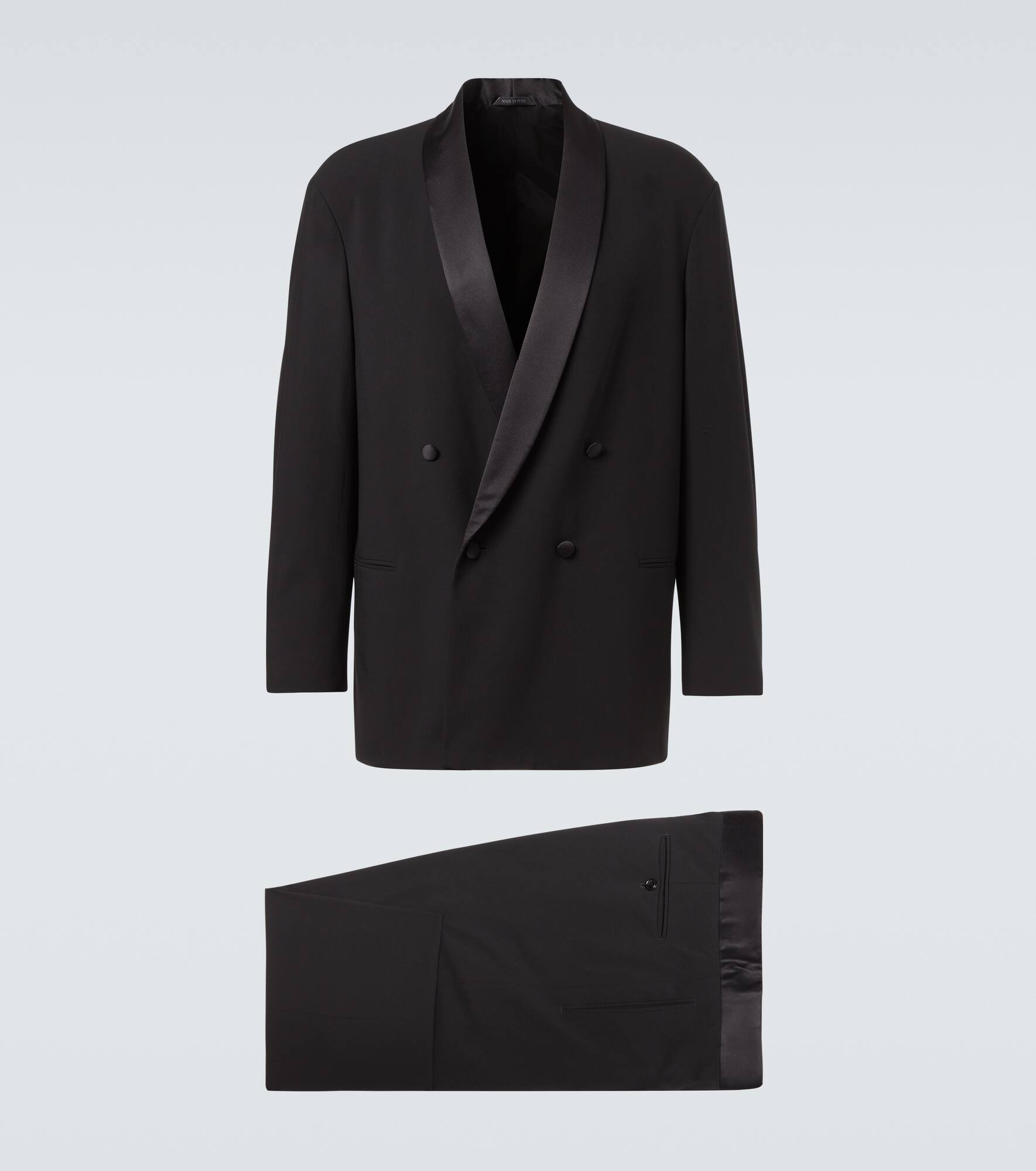 No tailoring edit is complete without a piece from the Italian powerhouse Giorgio Armani. This suit consists of a double-breasted jacket and straight-leg pants, both made from virgin wool. Product Details - Material: 100% virgin wool - Care instructions: dry clean - Made in Italy - Designer color name: Black - Item color: black - Material II: 100% silk - Lining: 94% cupro, 6% elastane - Contains non-textile parts of animal origin - Closure: double-breasted buttoned front, zipper fly, button and hook fastenings - Shawl lapel - Pockets: welt pockets, side slit pockets, back pockets - Vent: no vent - Two-piece set - Item number: P01047870 Size & Fit - True to size - Regular fit - Non-stretchy fabric - Falls below the hip - Straight leg - The model in the picture is 185cm-6'1" and wearing a size IT 50