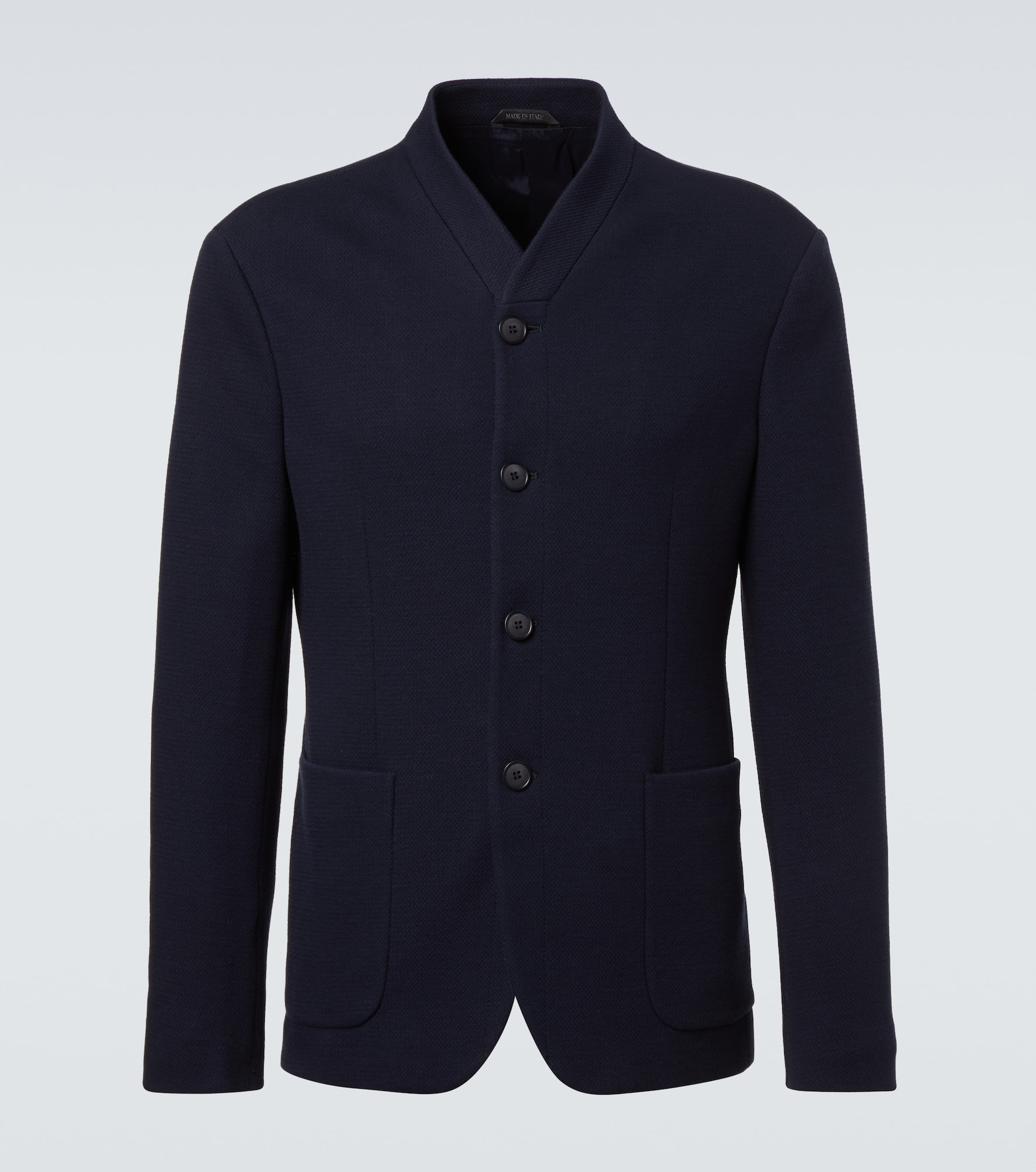 Made from a soft cotton and wool-blend jersey, this Giorgio Armani jacket features a form-fitting silhouette, a buttoned front, and large patch pockets. Product Details - Material: 45% wool, 45% cotton, 9% polyamide, 1% elastane - Care instructions: dry clean - Made in Italy - Designer color name: Dark Navy - Item color: blue - Lining: 94% cupro, 6% elastane - Closure: buttoned front - Pockets: patch pockets, internal pockets - Item number: P01047857 Size & Fit - True to size - For a looser fit, we recommend taking one size up - Slim fit - Non-stretchy fabric - Falls to the hip - Height of model is 188cm-74" and wears a size IT 50