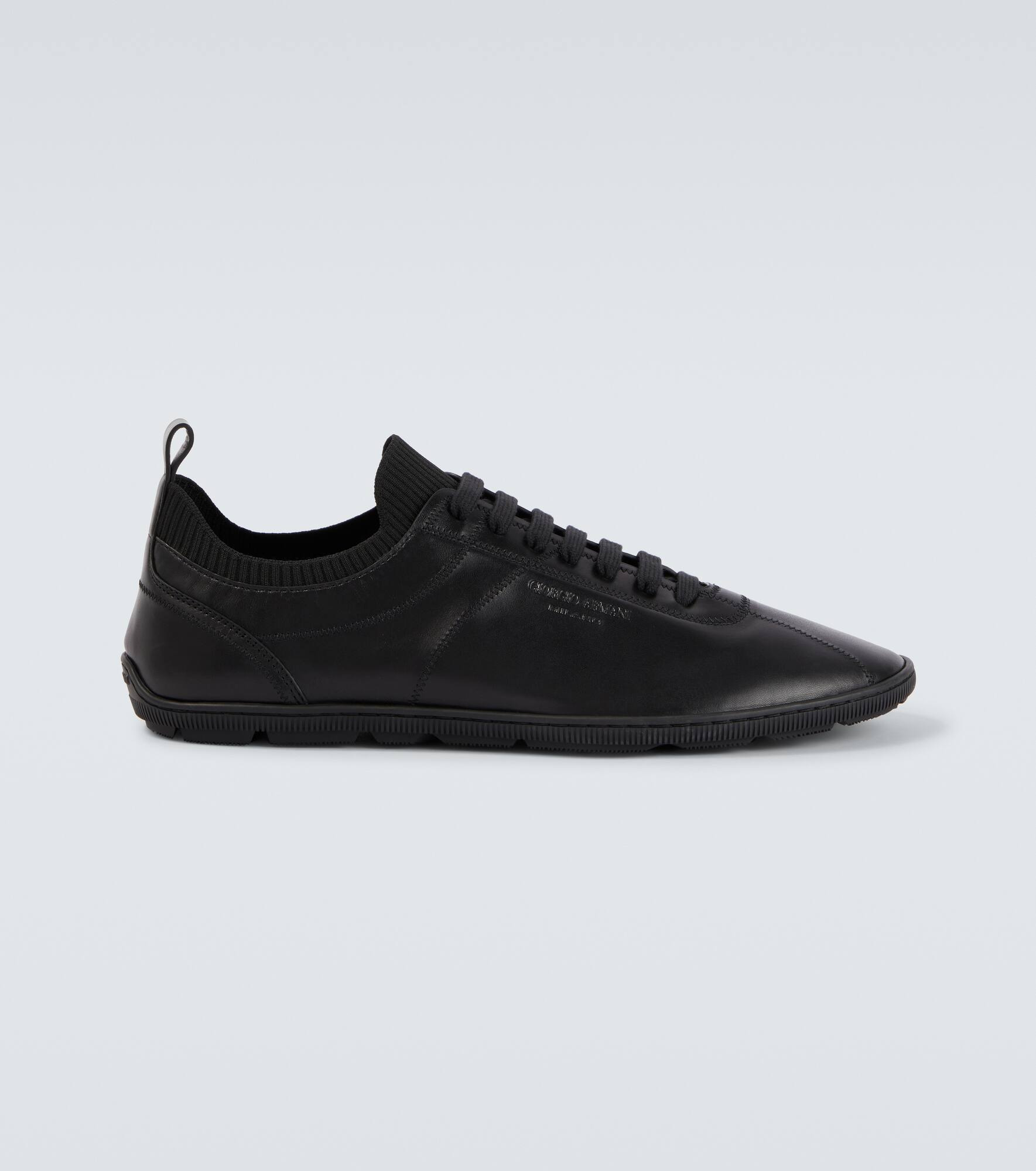 Known for its streamlined modernity, Giorgio Armani presents an elegant take on classic silhouettes and immaculate suiting. These sleek sneakers are crafted from polished leather and feature tonal stitching and ribbed-knit trims. Product Details - Upper: lamb leather - Lining: lamb leather, fabric - Sole: leather insole, rubber sole - Toe shape: round toe - Made in Italy - Includes: shoe box, dust bag - Designer color name: Nero/Nero - Item color: black - Item number: P01047832 Size & Fit - True to size - UK sizes