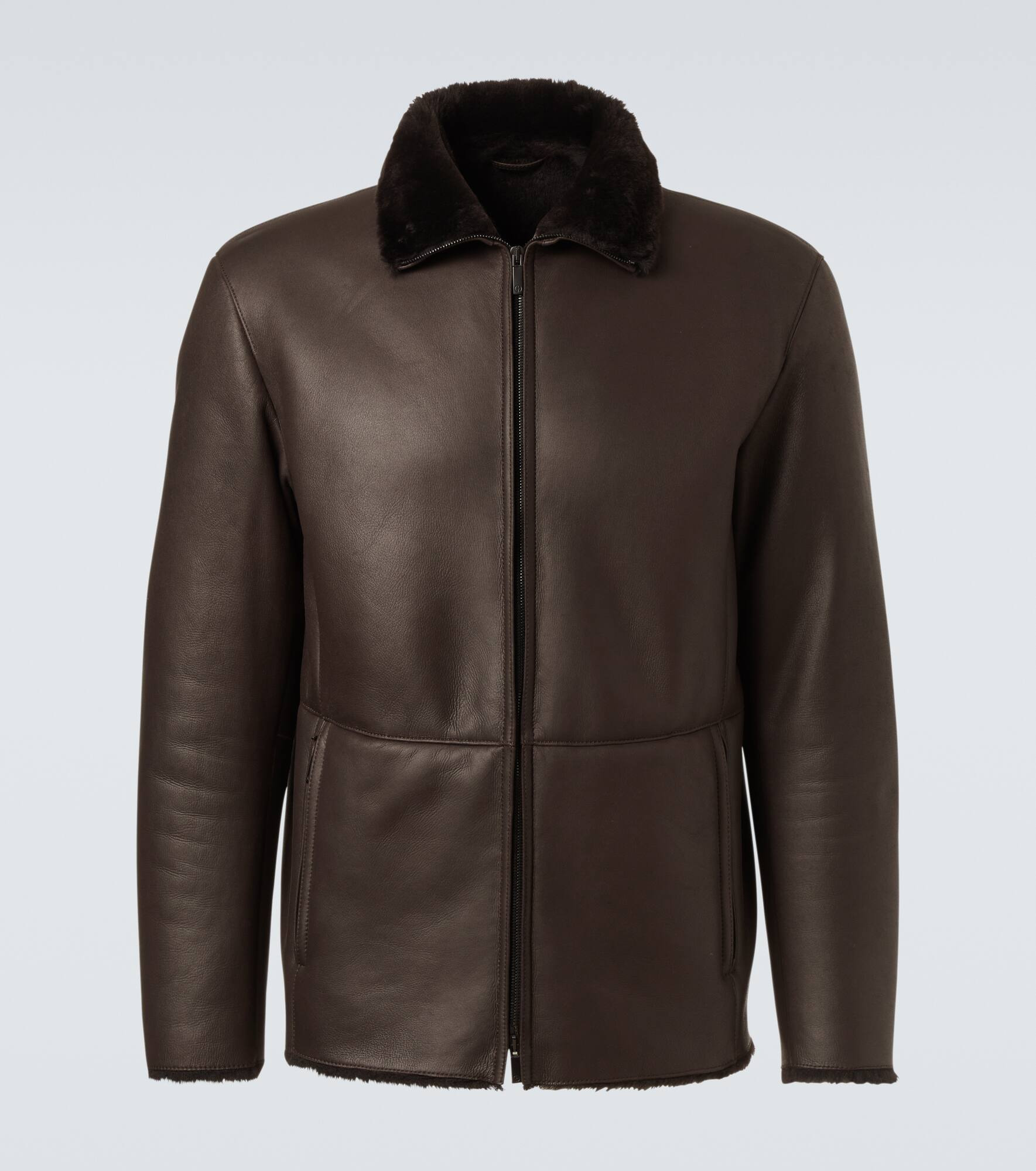 Known for its streamlined modernity, Giorgio Armani presents an elegant take on classic silhouettes and immaculate suiting. Crafted from leather, this sophisticated jacket is lined with shearling and features a high neckline with two-way zipped front closure. Product Details - Material: 100% shearling - Care instructions: specialist clean - Made in Italy - Designer color name: Mole - Item color: brown - Pocket lining: 100% cotton - Closure: two-way zipped front - Pockets: zipped pockets, internal pocket - Item number: P01047847 Size & Fit - True to size - Straight fit - Non-stretchy fabric - Falls to the hip - The model in the picture is 185cm-6'1" and wearing a size IT 50