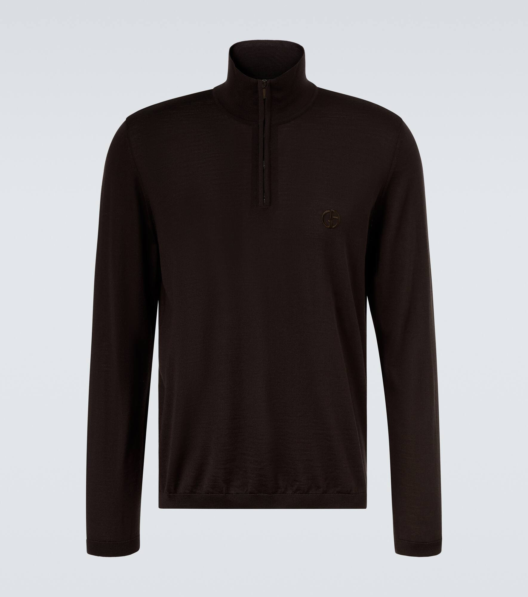 Known for its streamlined modernity, Giorgio Armani presents an elegant take on classic silhouettes. Crafted from soft virgin wool, this half-zip sweater features a stand-up collar and the brand's embroidered GA logo at the chest. Product Details - Material: 100% virgin wool - Care instructions: dry clean - Made in Italy - Designer color name: Mahogany - Item color: brown - Closure: partially zipped front - Collar: turtleneck - Item number: P01047848 Size & Fit - True to size - Straight fit - Stretchy fabric - Falls to the hip - Height of model is 188cm-74" and wears a size IT 50