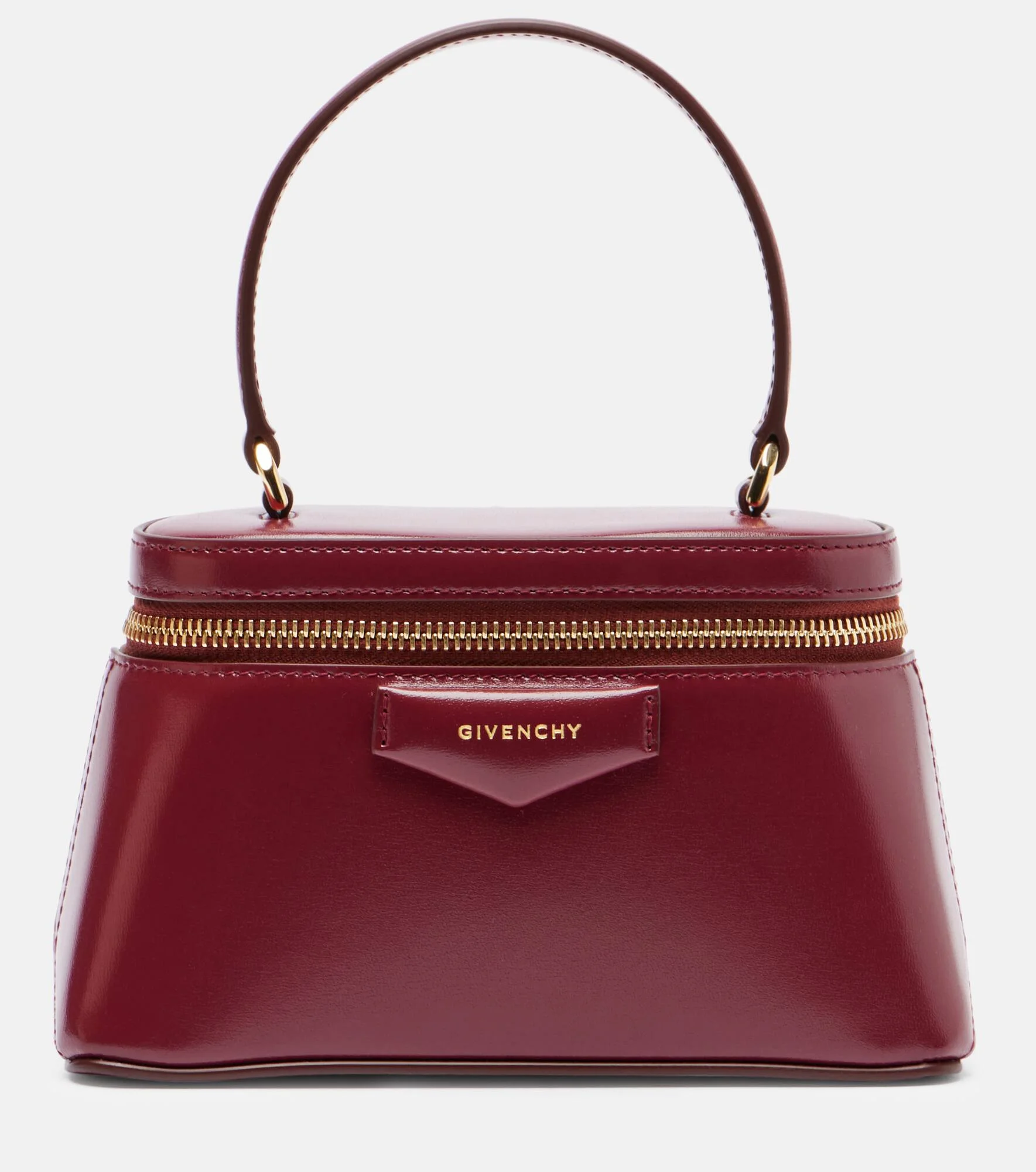 A compact accessory packed with style, the Antigona vanity bag from Givenchy is made from smooth calf leather. The design comes with a top handle and a detachable chain strap for adaptable carrying. Product Details - Material: calf leather - Lining: leather - Made in Italy - Color: burgundy - Designer color name: Burgundy - Item color: burgundy - Hardware color: gold - Closure: zipped top - Internal details: card slot - Top handle, Detachable chain and leather shoulder strap - Includes: dust bag - Item number: P01126190 Size & Fit - Height 11,5cm-4.5" - Width 18,5cm-7.5" - Depth 7,5cm-3" - Chain length 104cm-41" - Length of handle 28cm-11"