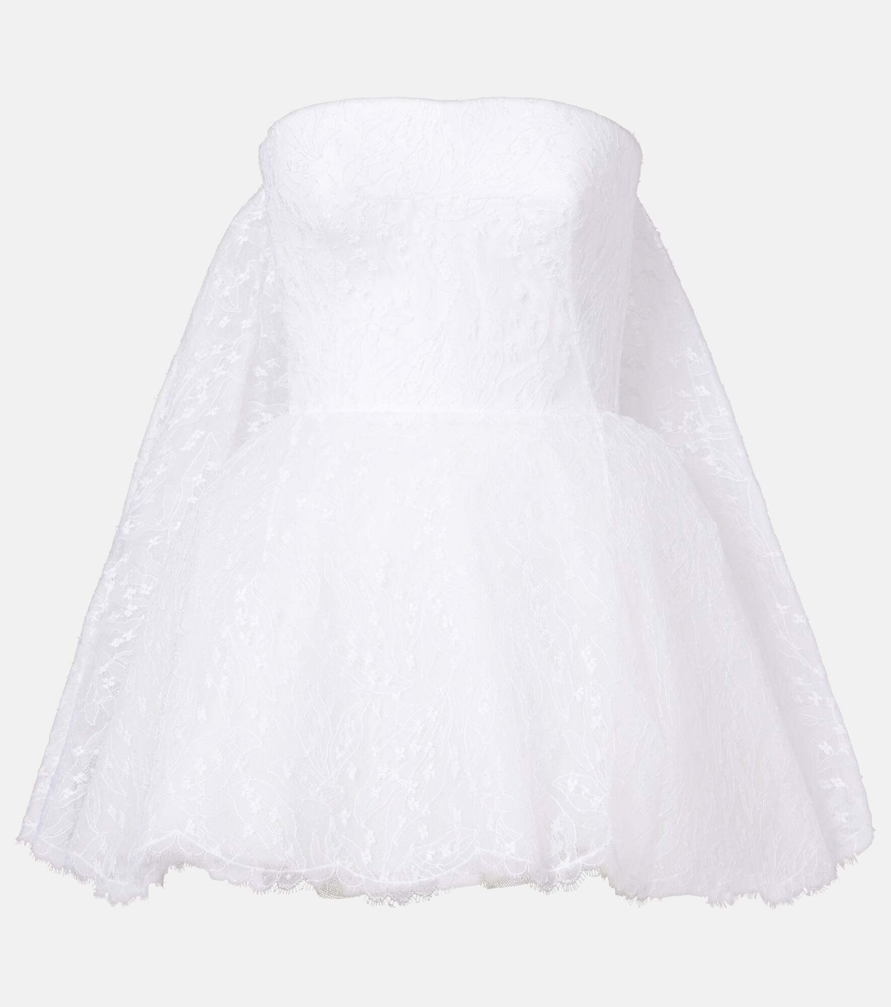 This strapless minidress from Givenchy exudes romantic charm with its delicate laced design. This style features a structured bustier silhouette, a matching cape, and an invisible zip closure at the back. Product Details - Material: 59% viscose, 41% polyamide - Care instructions: dry clean - Made in France - Designer color name: White - Item color: white - Material II: 100% polyamide - Material III: 100% polyester - Lining: 74% acetate, 26% silk - Built-in bustier - Closure: zip and hook fastening - Item number: P01080848 Size & Fit - True to size - Petite sizing - Strapless - Internal laced corset for support - Cinched waist - Non-stretchy fabric - Padded top - Height of model is 175cm-69" and wears a size FR 36