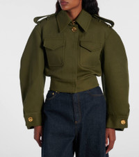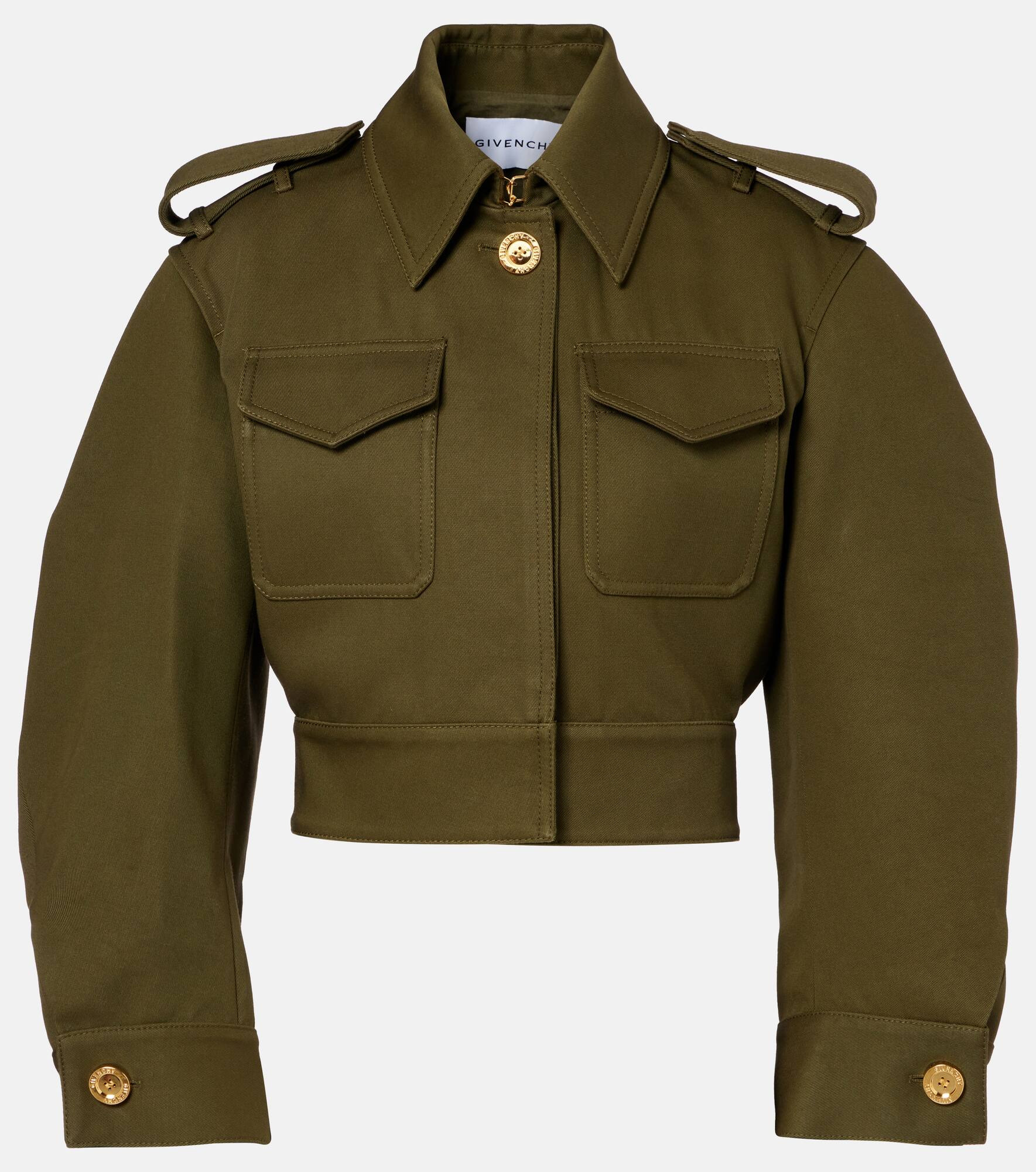 Givenchy's precise and timeless tailoring echoes the elegant silhouettes of the brand’s early years. Made in Italy with cotton and wool, this utility-style cropped jacket has flap chest pockets and a buttoned front. Product Details - Material: 76% cotton, 24% wool - Care instructions: dry clean - Made in Italy - Designer color name: Khaki - Item color: green - Lining: 100% cotton - Closure: buttoned front - Pockets: flap chest pockets - Cuff: buttoned - Hardware color: gold - Item number: P01080659 Size & Fit - True to size - Oversized shoulders - Cinched waist - Non-stretchy fabric - Slightly cropped - The model seen in the picture is 178cm-5'10" and wearing a size FR 36