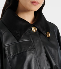 Product Details - Material: 100% leather - Care instructions: specialist clean - Made in Romania - Designer color name: Black - Material II: 72% viscose, 28% silk - Lining: 55% viscose, 45% polyester - Filling: 100% polyester - Closure: snap-buttoned front - Item number: P00998695 Size & Fit - True to size - Dropped shoulders - Designed for a loose fit - Slightly cropped - The model seen in the picture is 178cm-5'10" and wearing a size FR 36