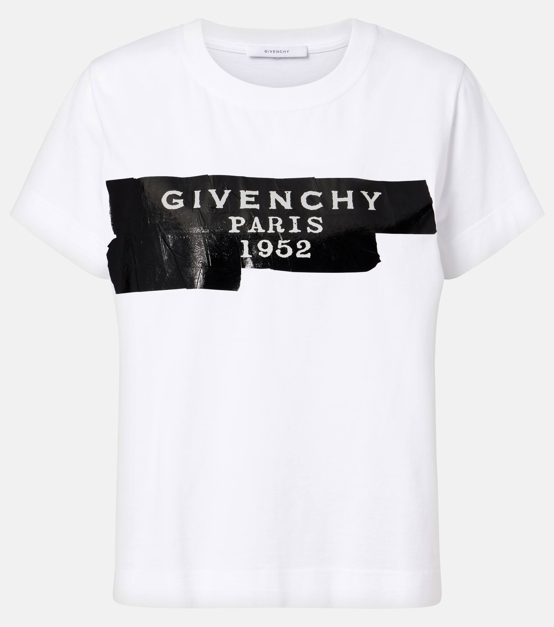 This distressed cotton T-shirt from Givenchy showcases the brand's dedication to a fashion-forward aesthetic. A glossy, tape-like embellishment is featured on the front, adding a dose of edge to the classic silhouette. Product Details - Material: 100% cotton - Care instructions: dry clean - Made in Italy - Designer color name: White - Item color: white - Item number: P01081132 Size & Fit - True to size - Designed for a loose fit - Slightly stretchy fabric - Falls to the hip - Height of model is 175cm-69" and wears a size XS