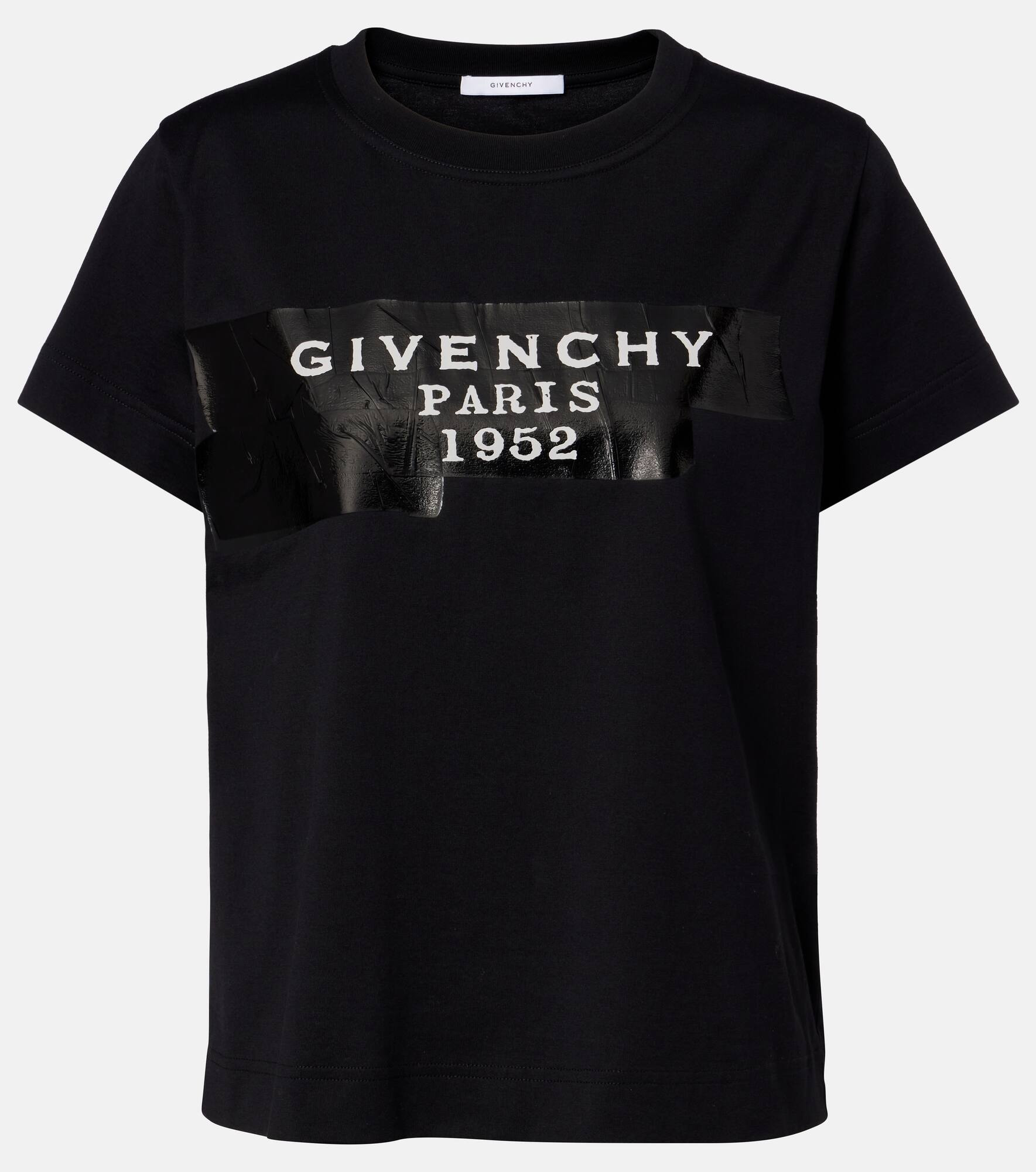 This distressed cotton T-shirt from Givenchy showcases the brand's dedication to a fashion-forward aesthetic. A glossy, tape-like embellishment is featured on the front, adding a dose of edge to the classic silhouette. Product Details - Material: 100% cotton - Care instructions: dry clean - Made in Portugal - Designer color name: Black - Item color: black - Collar: crewneck - Sleeves: short-sleeved - Item number: P01081134 Size & Fit - True to size - Designed for a loose fit - Slightly stretchy fabric - Falls to the hip - Height of model is 175cm-69" and wears a size XS