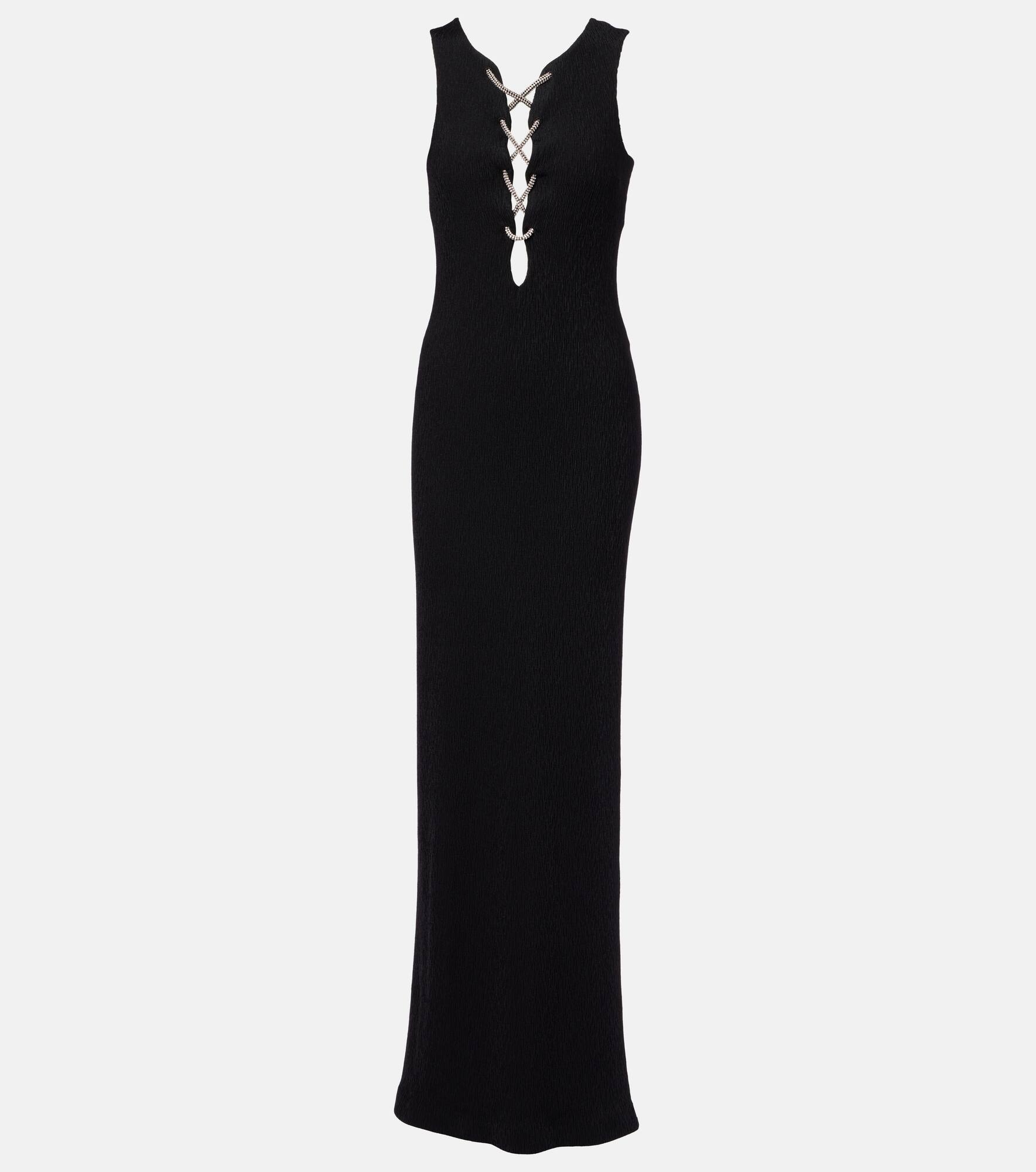 EVENING DRESS IN TEXTURED JERSEY WITH CRYSTAL LACES