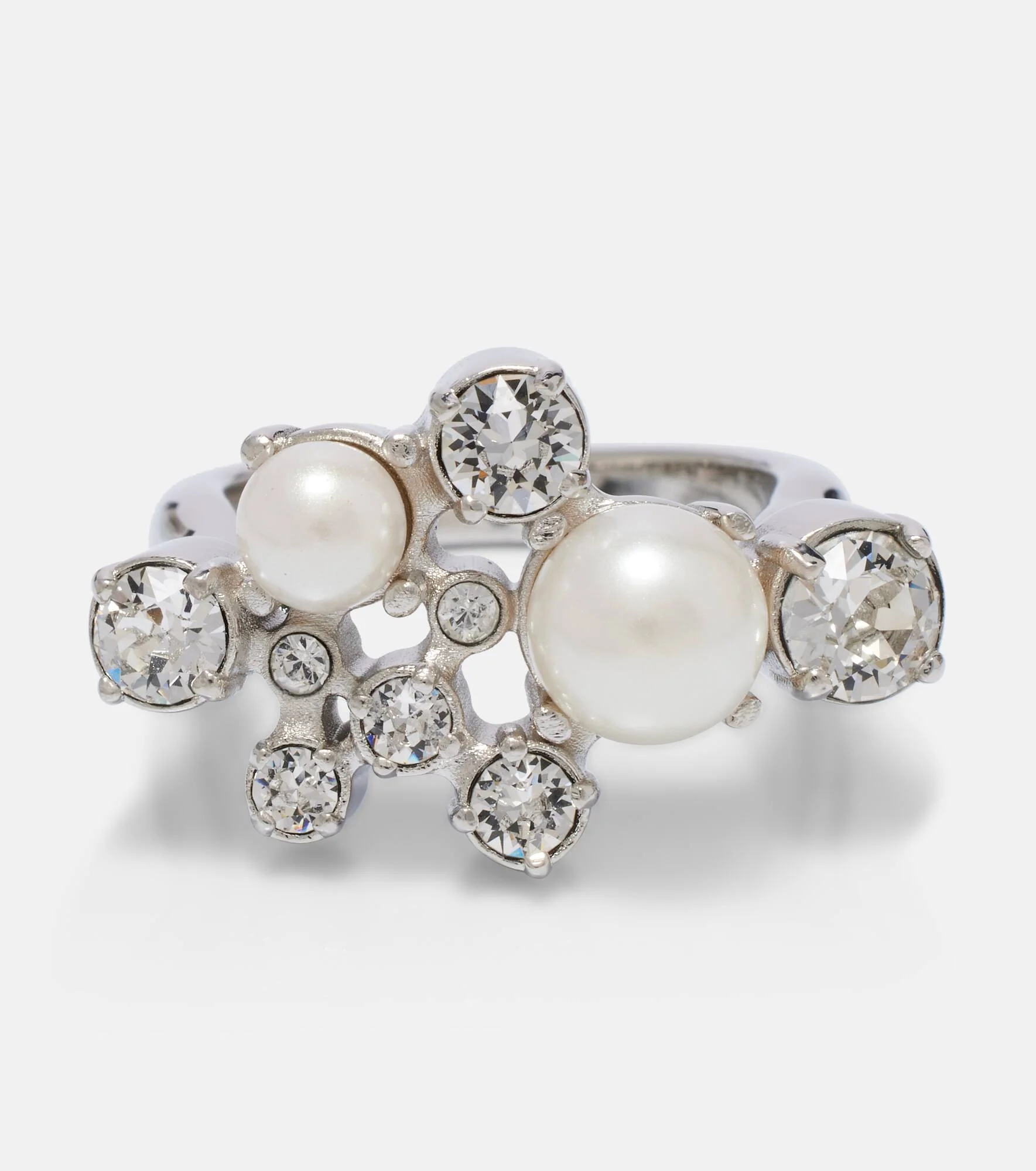 Dubbed the “enfant terrible” of haute couture, Givenchy revolutionized fashion with easy, elegant, architectural designs. This luminous ring is embellished with a sparkling cluster of clear crystals and faux pearls. Product Details - Material: brass, crystals, pearls - Made in Italy - Item color: silver - Includes: box, dust bag - Item number: P01134259 Size & Fit - Width 1.5cm-0.5"