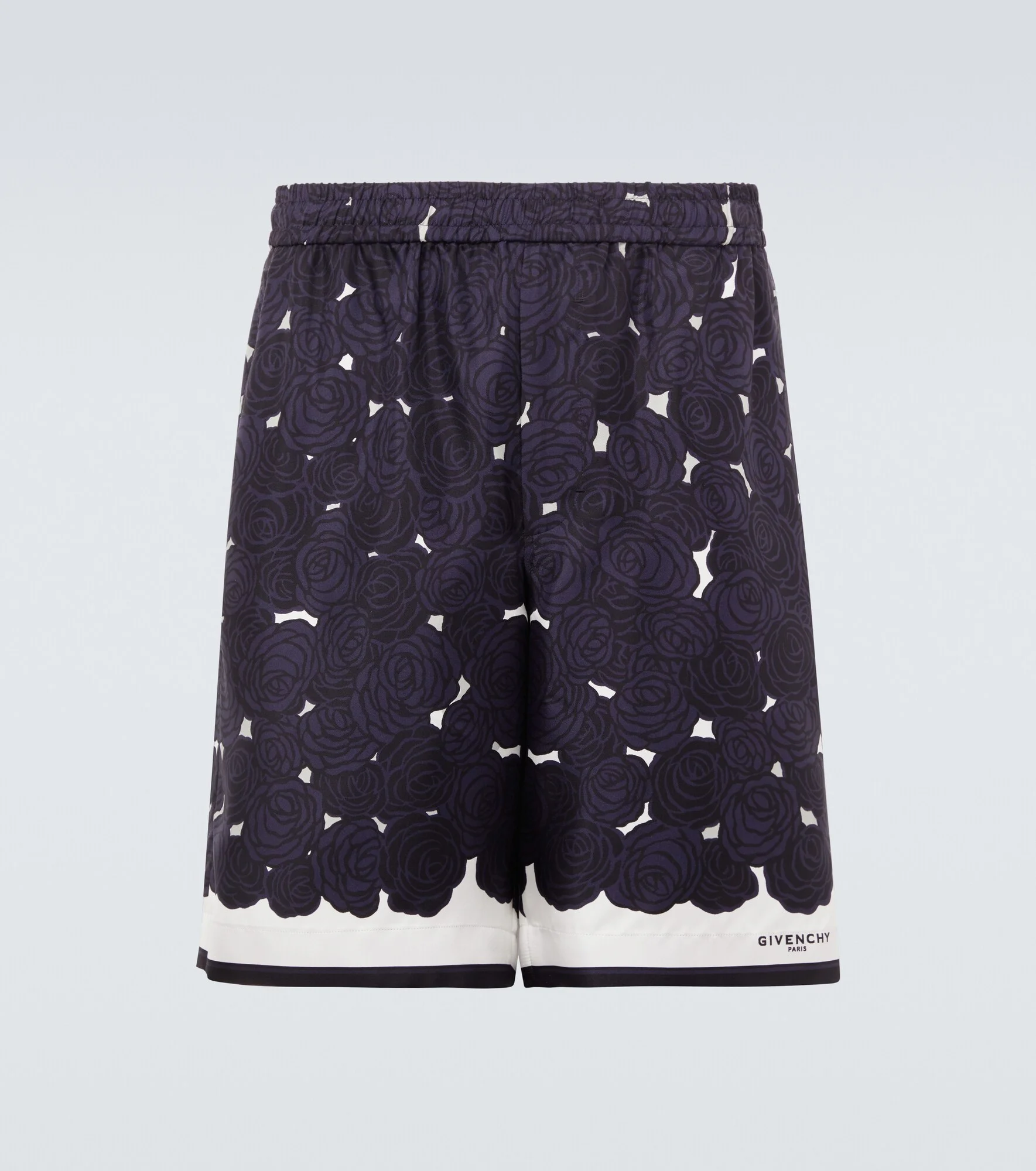 These comfortable shorts from Givenchy are crafted in Italy from pure silk twill. The design features an all-over floral print of sophisticated dark roses. Product Details - Material: 100% silk - Care instructions: dry clean - Made in Italy - Color: blue - Designer color name: Dark Navy - Elasticated waistband - Pockets: side slit pockets, back pocket - Item number: P01160373 Size & Fit - Fits small to size - we recommend trying one size larger - Elasticated waist - Adjustable at the waist - Non-stretchy fabric - Wide-leg - The model in the picture is 185cm-6'1" and wearing a size 52