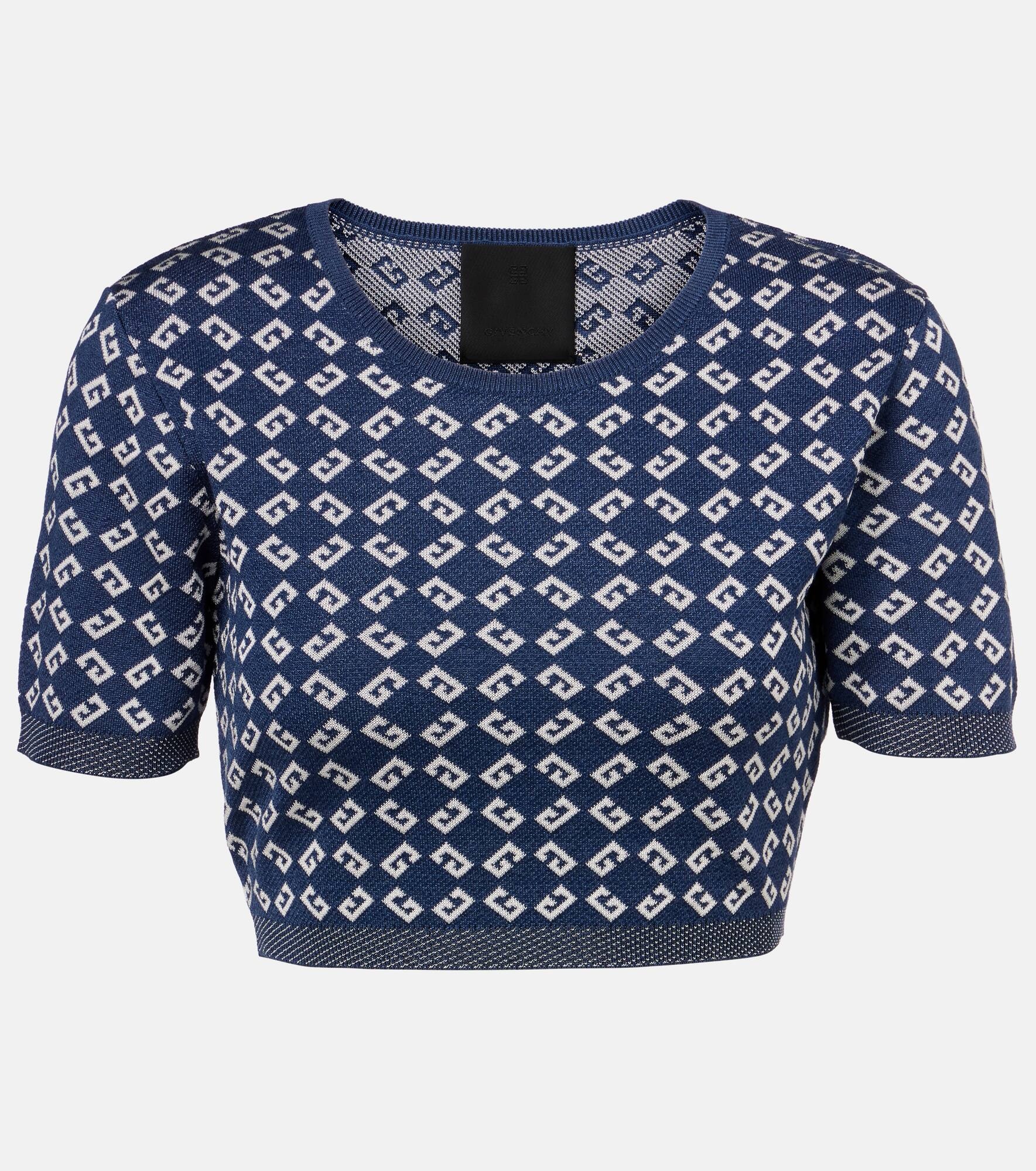 Givenchy's signature Monogram 72 pattern features on this top in fine jacquard. The design is made for a cropped fit, and finished with contrast trims around the hem and sleeves. Product Details - Material: 68% viscose, 25% cotton, 7% polyamide - Care instructions: dry clean - Made in Italy - Designer color name: Denim Blue - Item color: blue - Item number: P01032099 Size & Fit - True to size - Fitted - Stretchy fabric - Cropped - The model seen in the picture is 178cm-5'10" and wearing a size XS