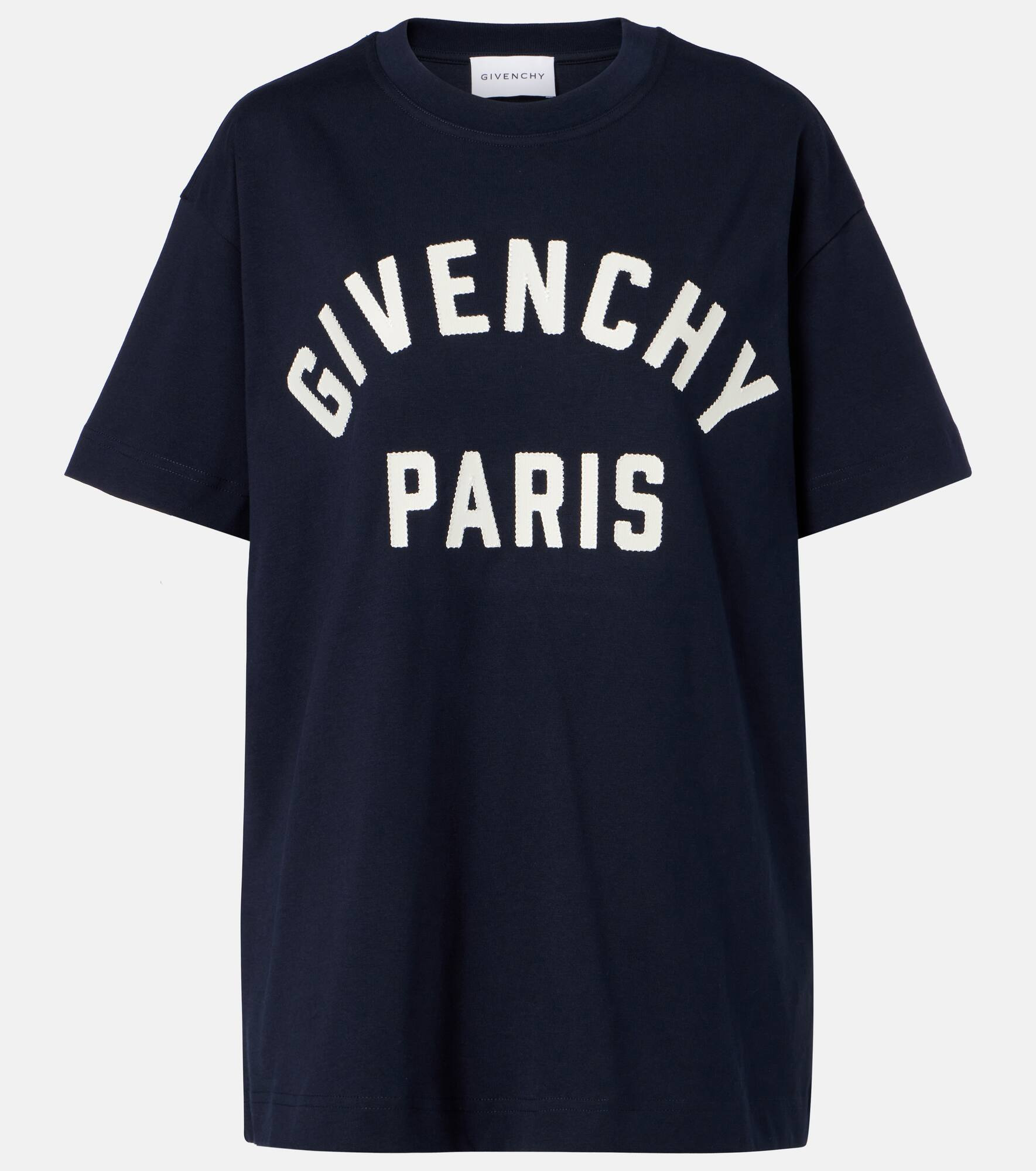 The navy Paris T-shirt by Givenchy is crafted from soft cotton jersey and features the brand's signature embroidery along with a classic crewneck. This oversized design effortlessly combines casual comfort with elevated style. Product Details - Material: 100% cotton - Care instructions: machine wash at 30 degrees - Made in Portugal - Designer color name: Navy/White - Item color: blue, white - Embroidery: 100% polyester - Sleeves: short-sleeved - Collar: crewneck - Item number: P01095168 Size & Fit - True to size - Dropped shoulders - Oversized - Non-stretchy fabric - Falls below the hip - The model seen in the picture is 178cm-5'10" and wearing a size XS