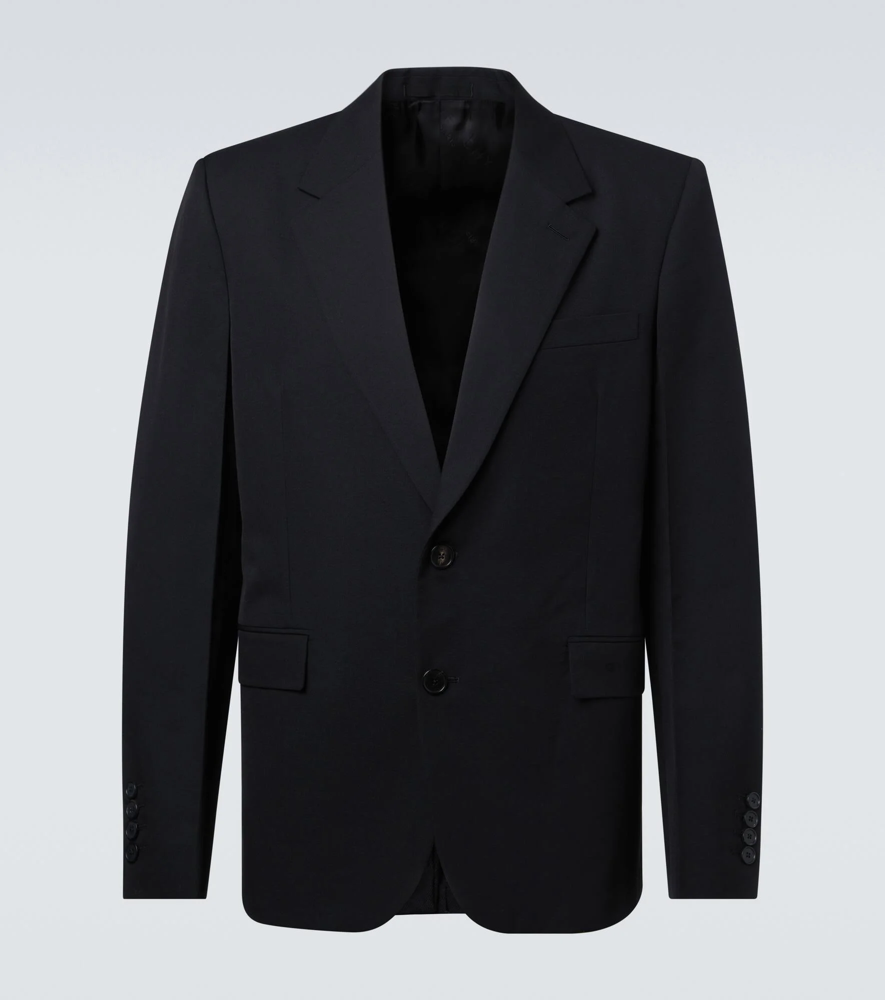 Givenchy's precise and timeless tailoring echoes the elegant silhouettes of the brand’s early years. A suited example, this polished blazer is cut from pure wool into a single-breasted silhouette. Product Details - Material: 100% wool - Care instructions: dry clean - Made in Italy - Color: black - Designer color name: Black - Item color: black - Trim: 100% wool - Lining: 100% cupro - Sleeve lining: 100% viscose - Notched lapel - Shoulder pads - Pockets: breast pocket, flap pockets, internal pockets - Cuff: four buttons - Closure: single-breasted (two buttons) - Vent: single - Item number: P01125677 Size & Fit - True to size - Shoulder pad inserts - Regular fit - Non-stretchy fabric - Falls below the hip - The model in the picture is 185cm-6'1" and wearing a size IT 50