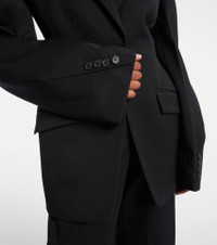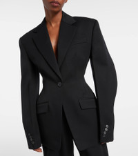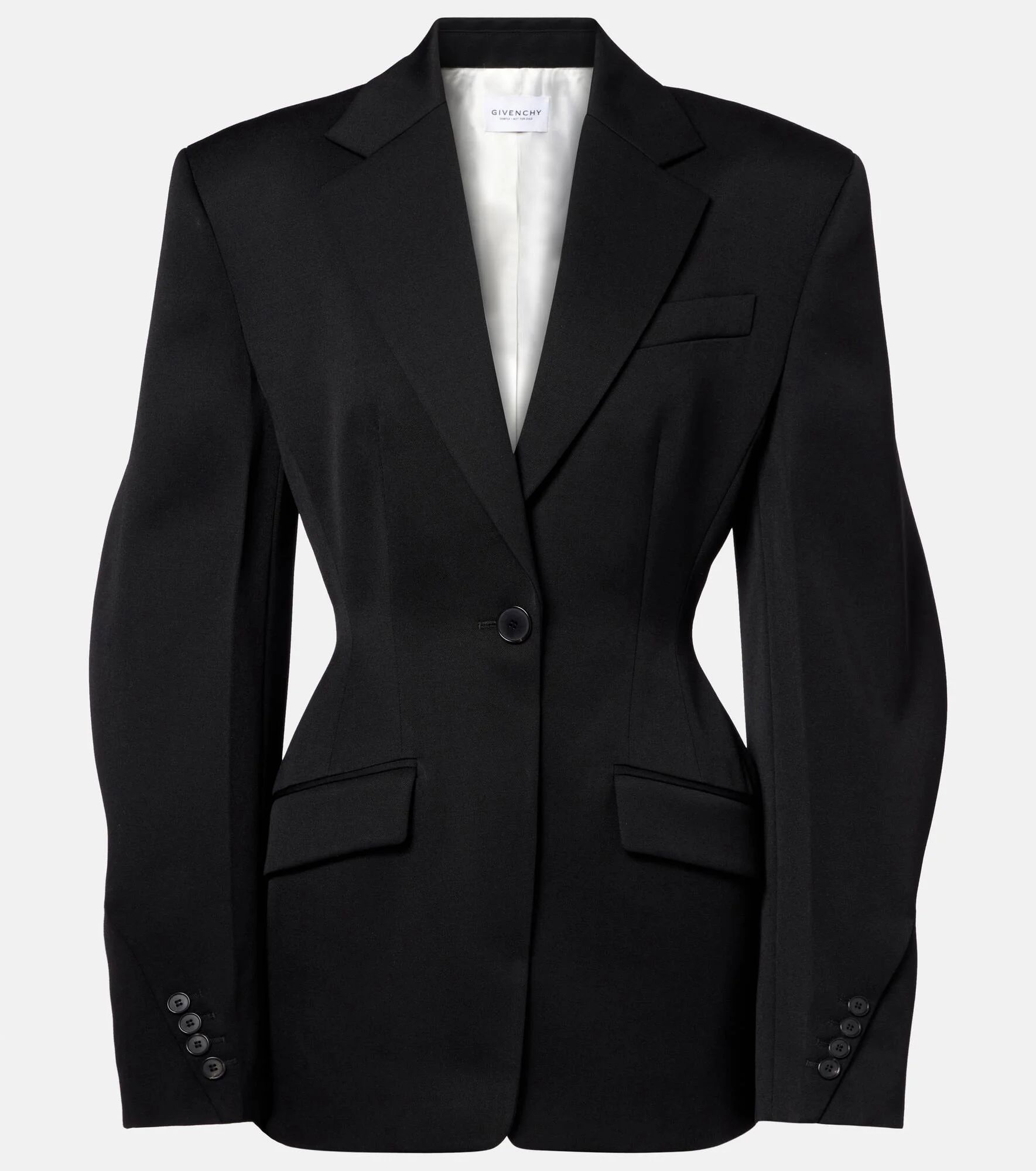 Givenchy's precise and timeless tailoring echoes the elegant silhouettes of the brand’s early years. Made in Italy from pure wool, this single-breasted blazer is fully lined and features flap pockets and buttoned cuffs. Product Details - Material: 100% wool - Care instructions: dry clean - Made in Italy - Designer color name: Black - Item color: black - Sleeve lining: 100% polyester - Pocket lining: 100% polyester - Lining: 100% viscose - Closure: single-breasted (one button) - Fully lined - Pockets: flap pockets - Cuff: four buttons - Item number: P01081161 Size & Fit - True to size - Shoulder pad inserts - Cinched waist - Non-stretchy fabric - Falls below the hip - Height of model is 175cm-69" and wears a size FR 36
